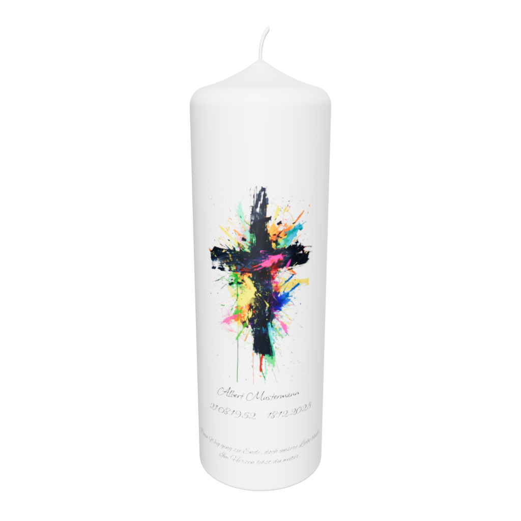 Die Trauerkerze „Buntes Kreuz“ vereint Ausdruckskraft und Lebendigkeit.
