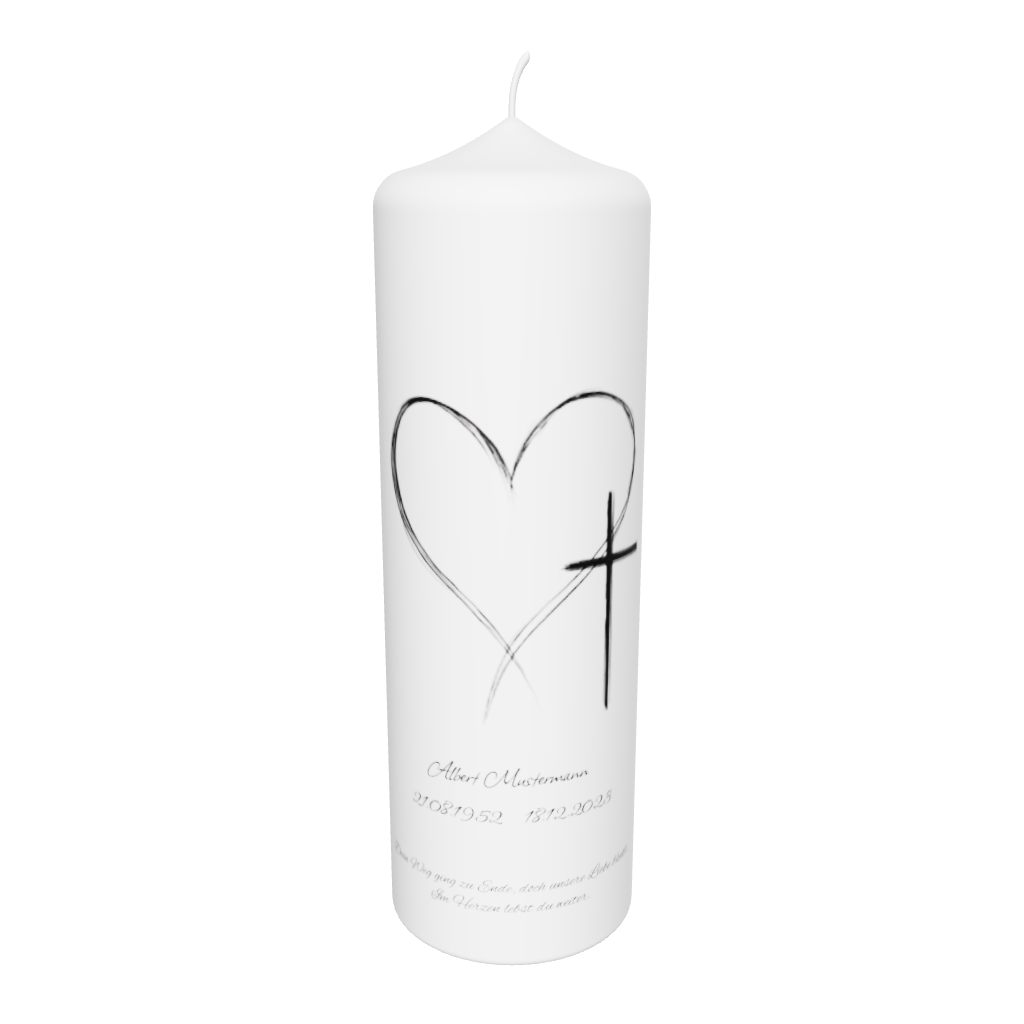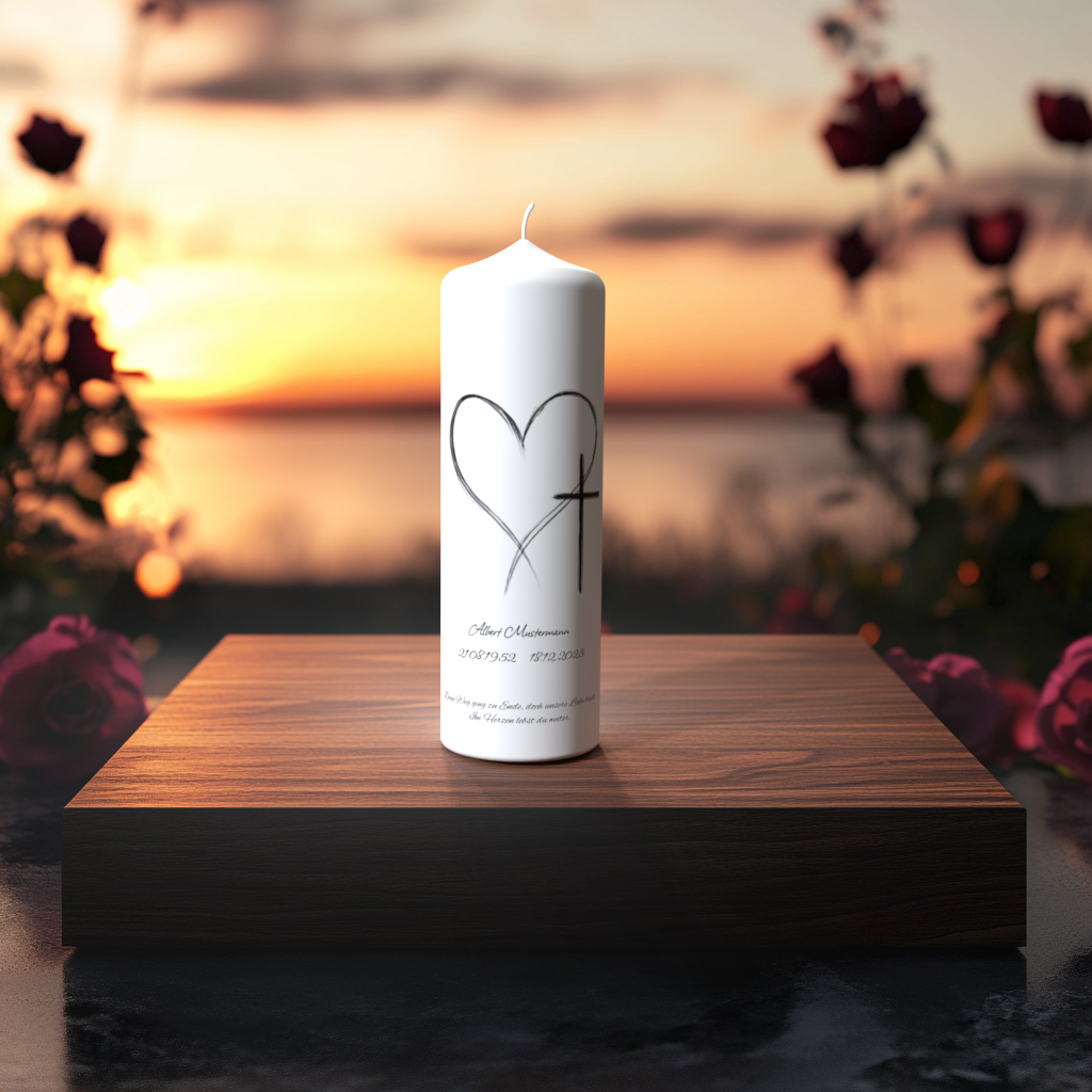 Die Trauerkerze „Herz & Kreuz Strichzeichnung“ verbindet klare Linien mit einer tiefen Symbolik.