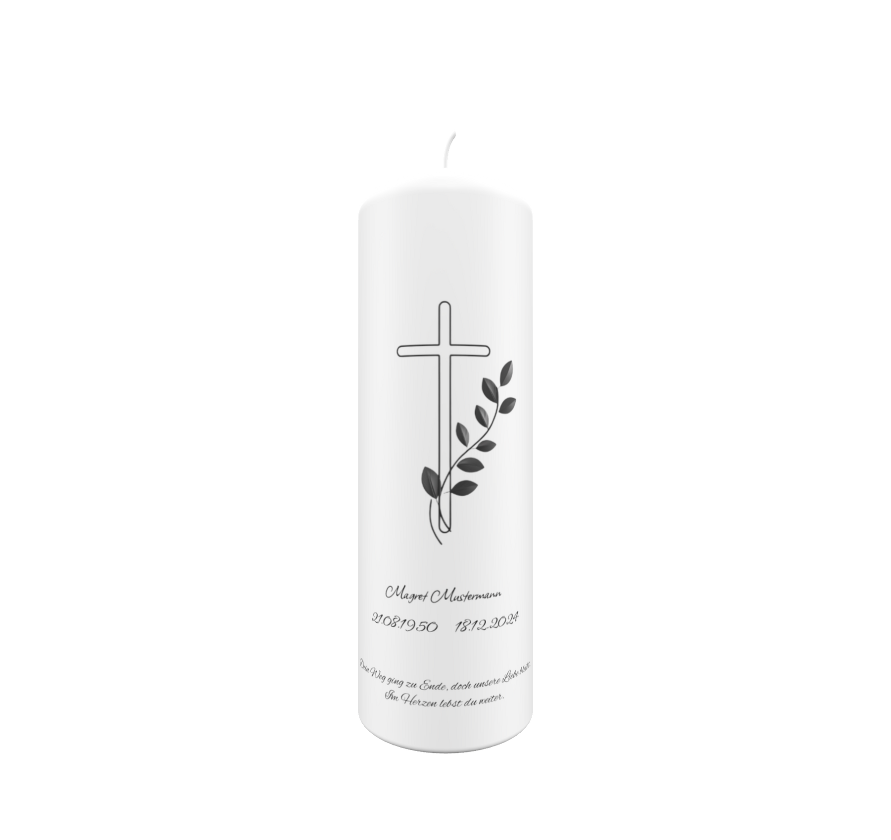 Diese Trauerkerze mit Kreuz und Olivenzweig ist ein stilles Symbol für Hoffnung, Frieden und ewige Verbundenheit.