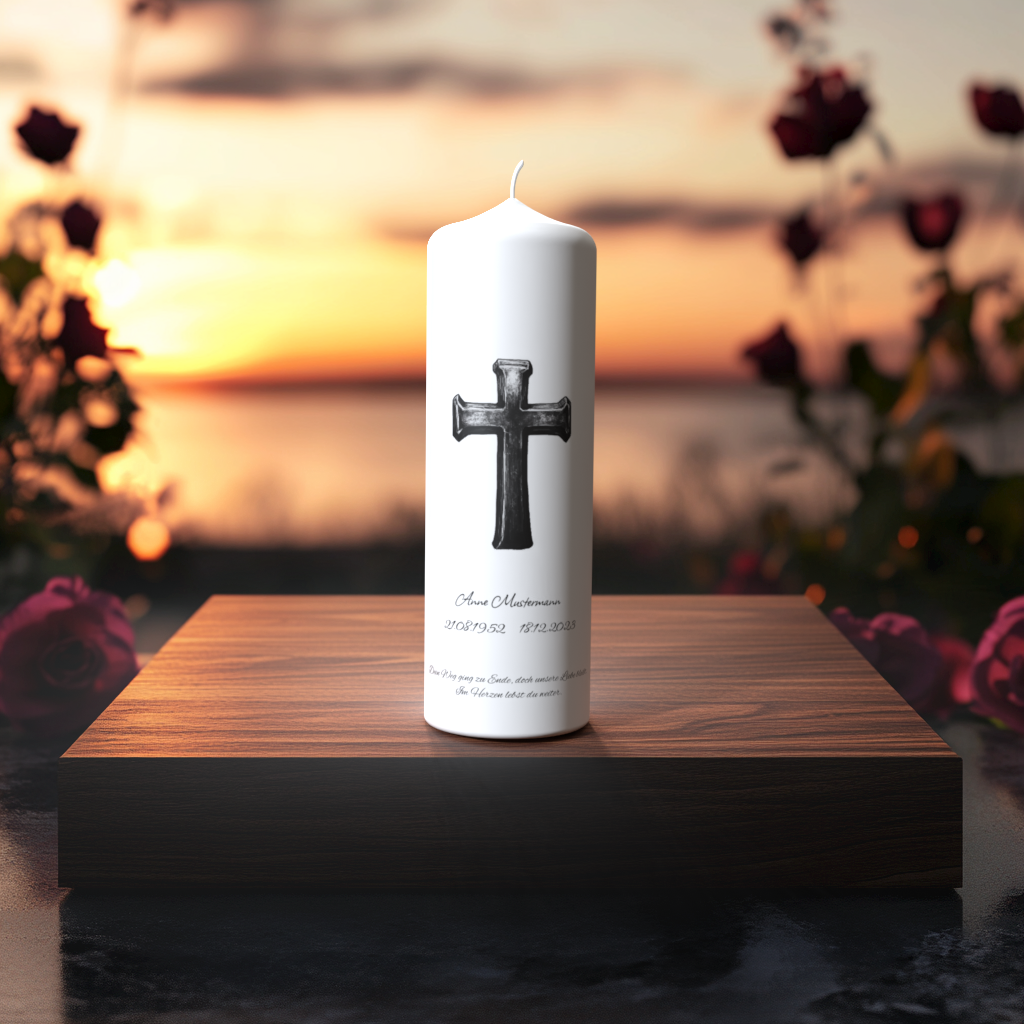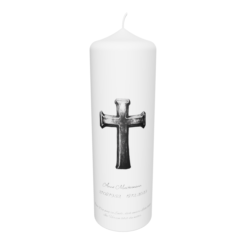 Die Trauerkerze „Eisenkreuz“ steht für Stärke, Würde und den festen Glauben, der durch schwere Zeiten trägt.