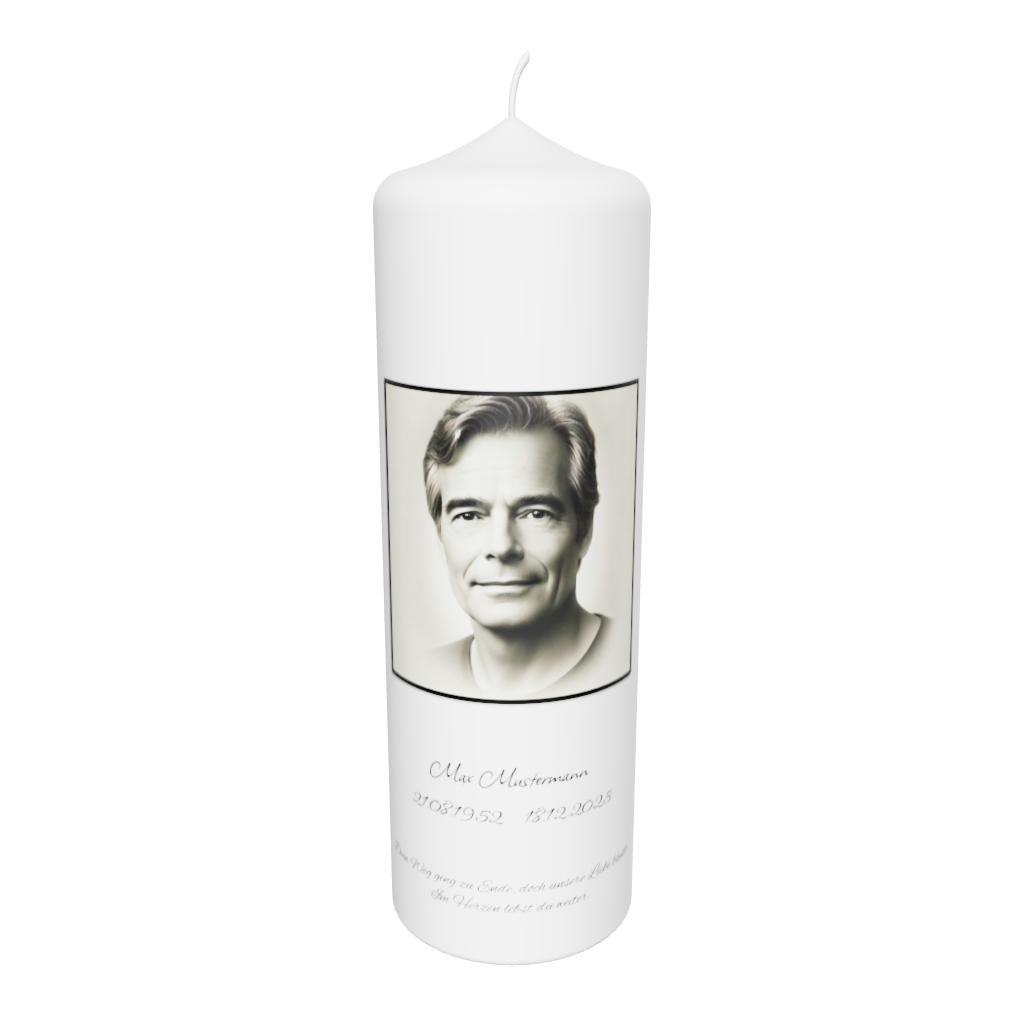 Die personalisierte Trauerkerze mit Foto ist ein liebevoll gestaltetes Erinnerungsstück an einen geliebten Menschen.