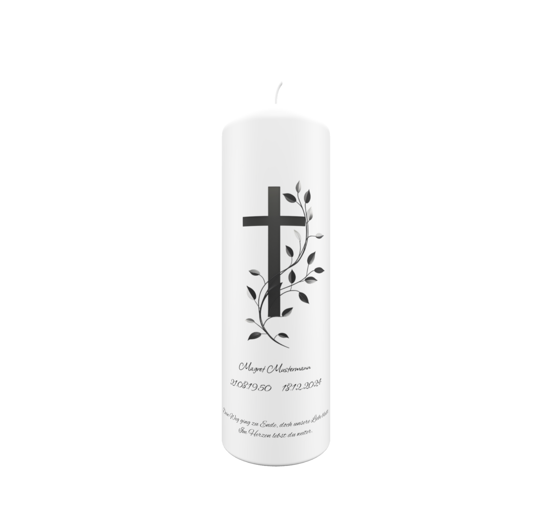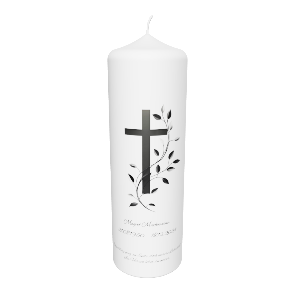 Die Trauerkerze „Kreuz & Blattranke“ vereint Glauben, Natur und Trost in einem stilvollen, ruhigen Design.