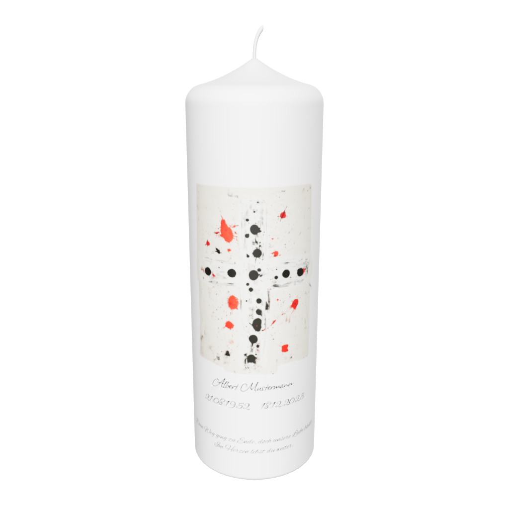 Die Trauerkerze „Punktkreuz & Farbsymbole“ vereint klare Formen mit sanfter Symbolik.
