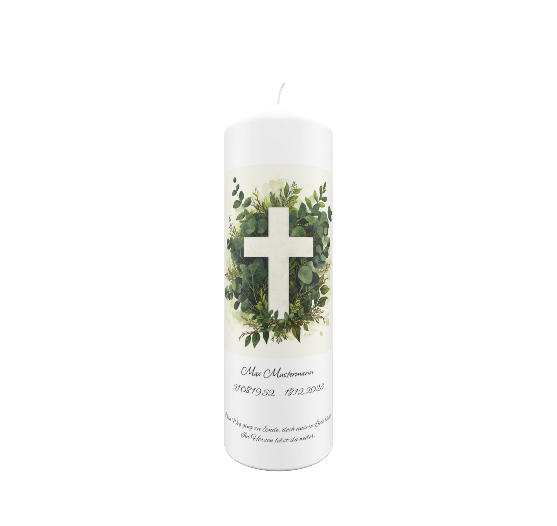 Freigestellte weiße Trauerkerze mit Kreuz im grünen Eukalyptuskranz – Symbol für Glauben, Hoffnung und Erinnerung.