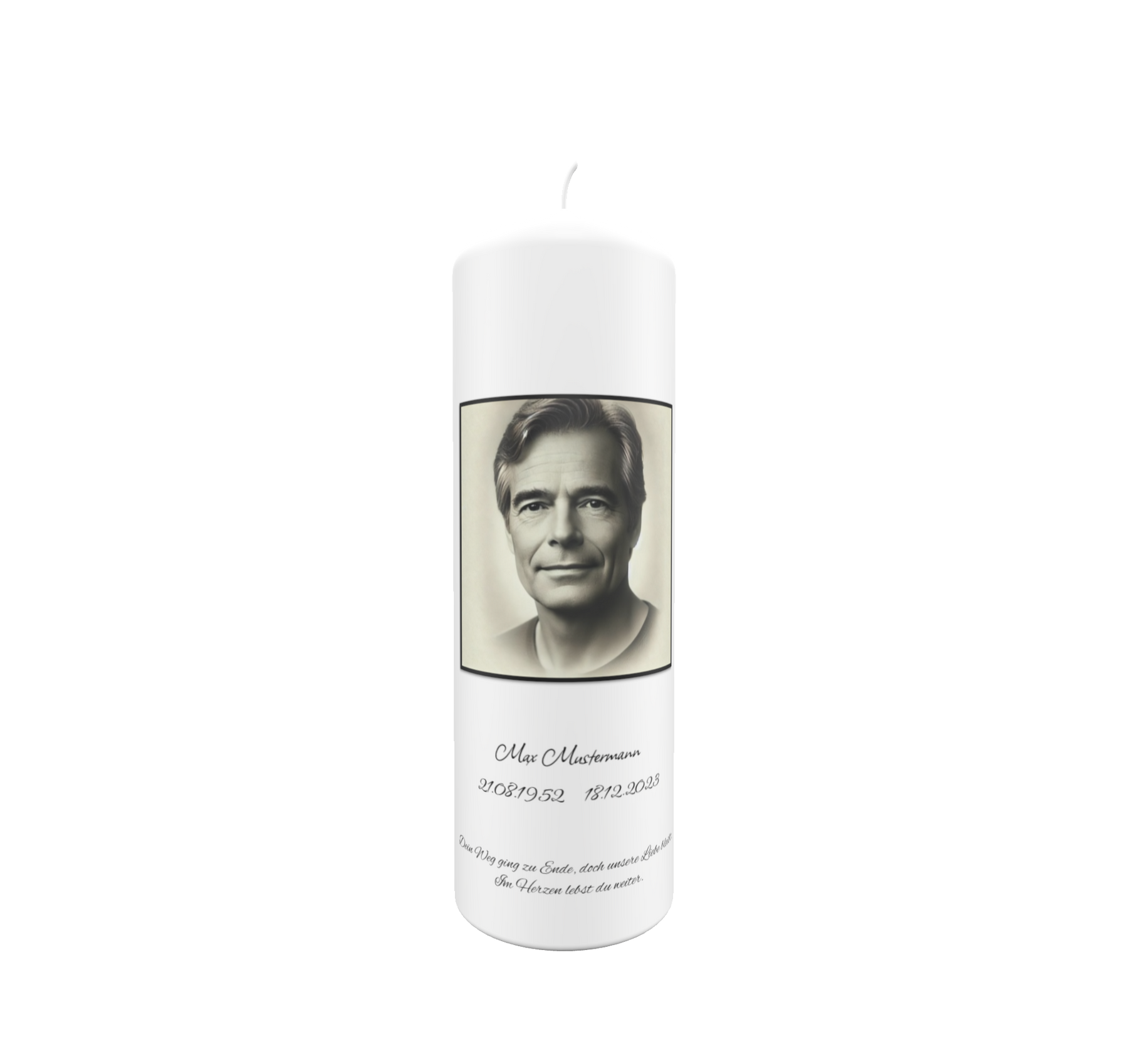 Weiße Trauerkerze mit Fotoporträt und dezentem Schriftzug auf hellem Hintergrund – Symbol für Erinnerung und Nähe.