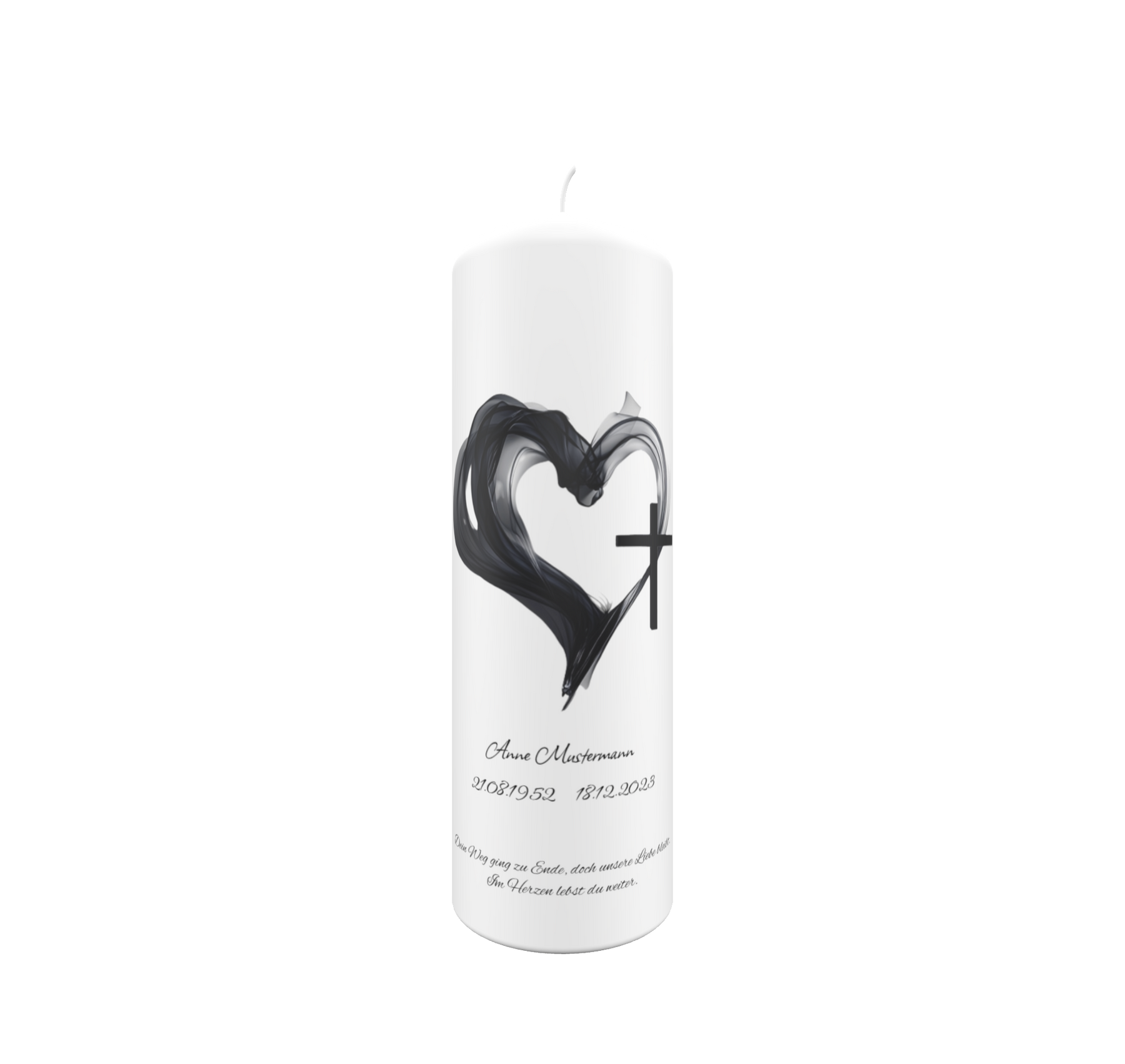 Weiße Trauerkerze mit schwarzem Herz- und Kreuzmotiv auf hellem Hintergrund – Symbol für Liebe, Glaube und Erinnerung.