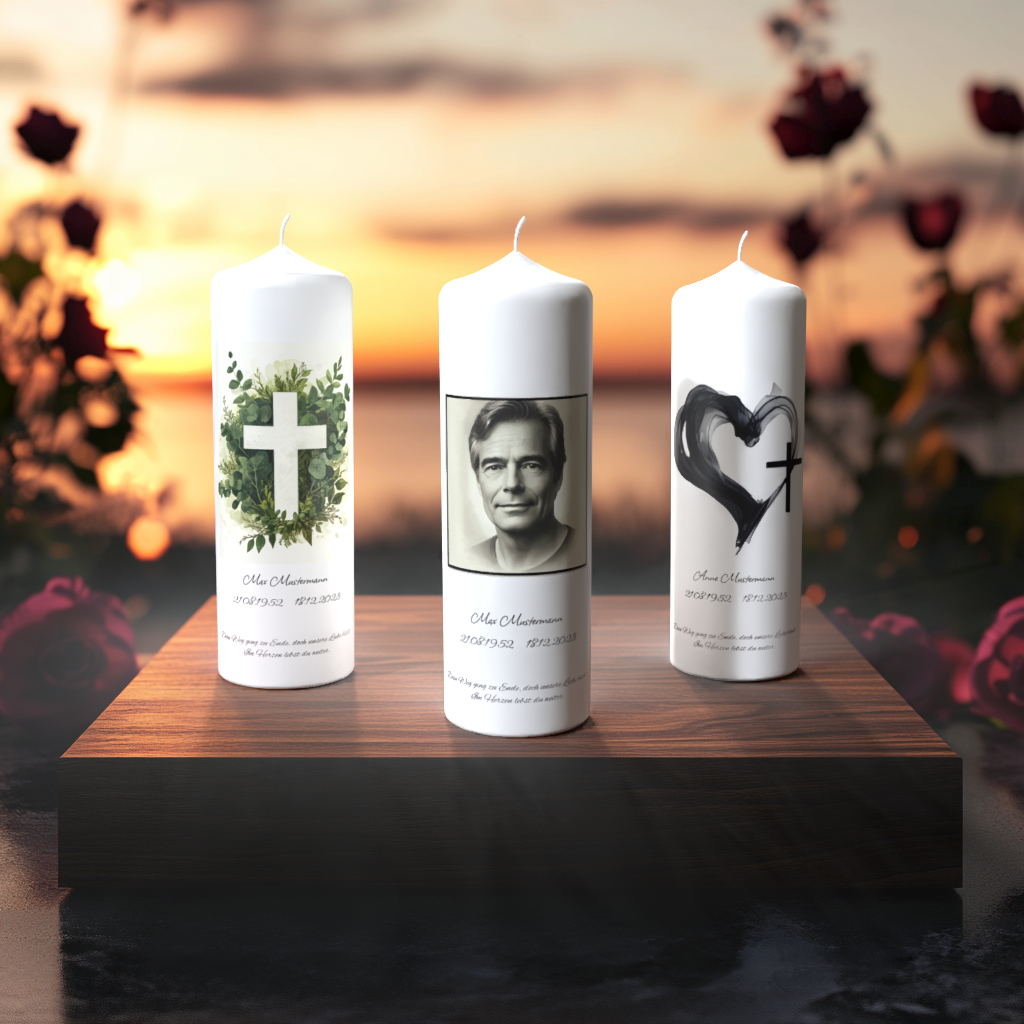 Drei Trauerkerzen auf Holzpodest vor Sonnenuntergang: mit grünem Kreuzmotiv, Fotoporträt und schwarzem Herzsymbol, umgeben von Rosen – Symbol für Erinnerung und Trost.