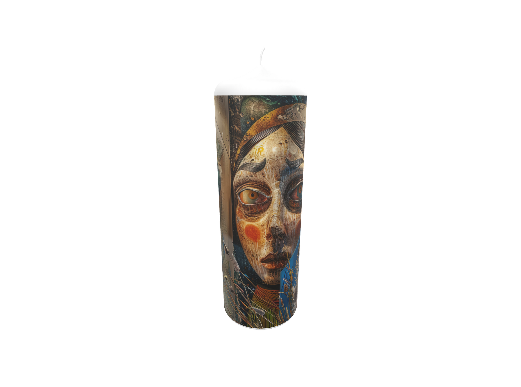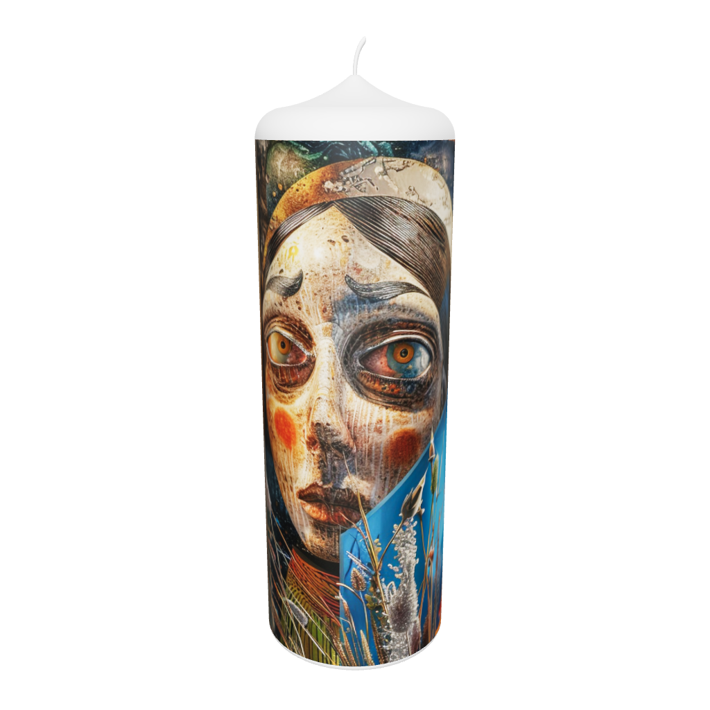 Künstlerkerze mit großem Porträt und goldenen Ornamenten – Sinnbild für inneres Leuchten, Achtsamkeit und spirituelle Tiefe.