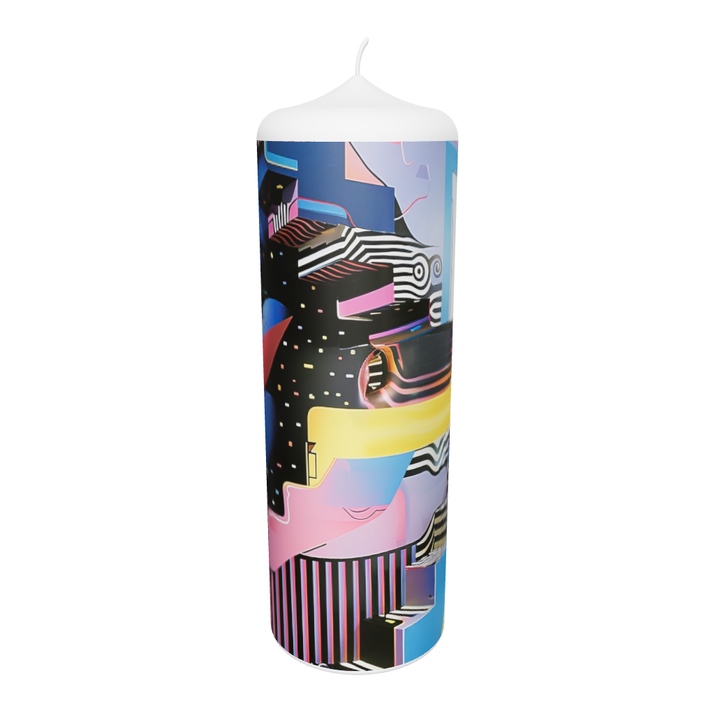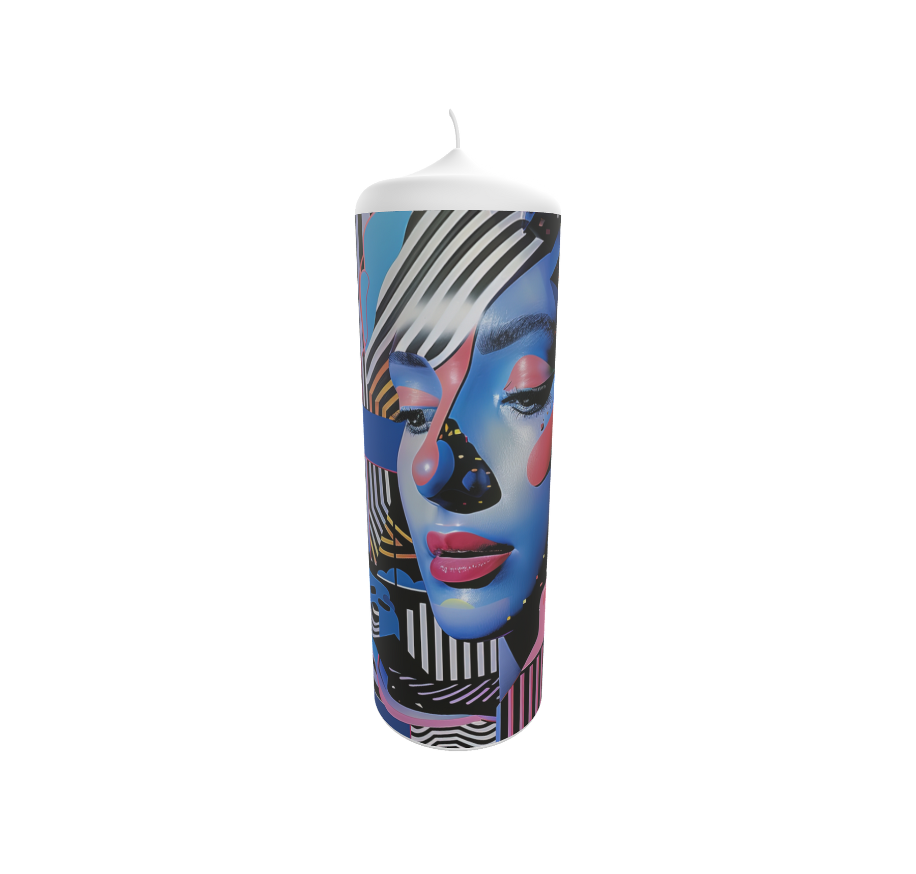 Künstlerkerze mit abstraktem Porträt und fließenden digitalen Mustern in Blau- und Rosatönen.