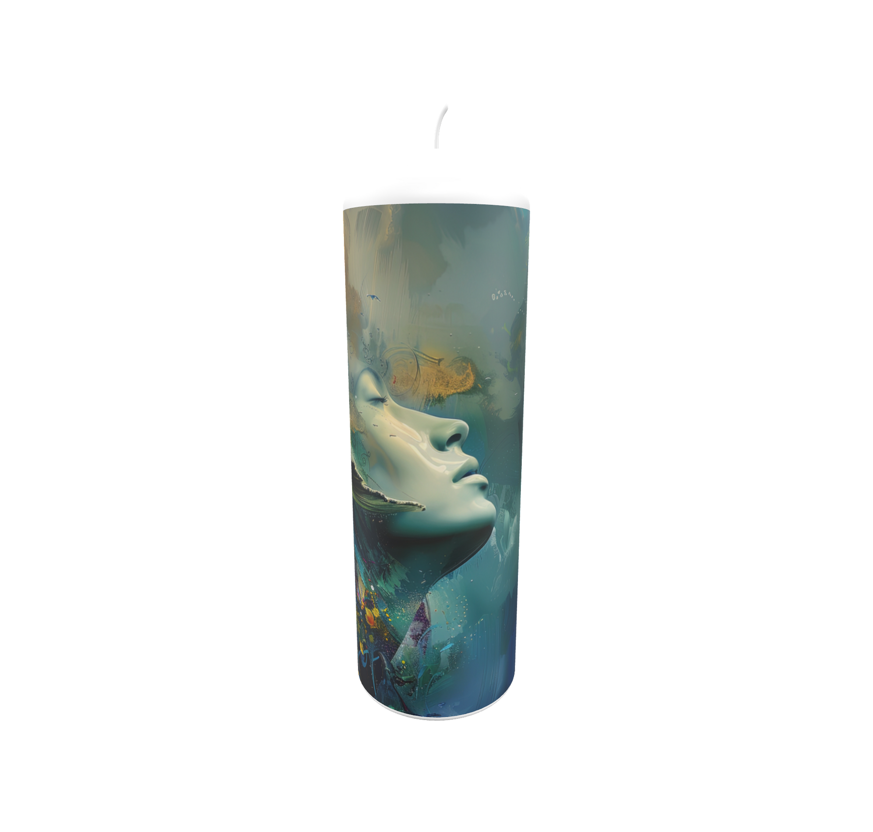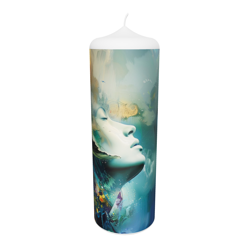 Künstlerkerze mit weiblichem Profil, Unterwassertraum und sanften Blautönen.