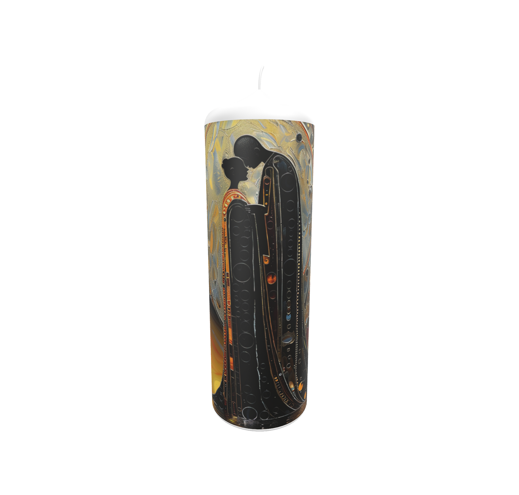 Die Künstlerkerze „Ewigkeit im Licht“ zeigt eine anmutige Figur im goldenen Glanz spiralförmiger Lichtbewegungen. Das Zusammenspiel aus Schwarz, Gold und zartem Schimmer verleiht dem Motiv eine spirituelle Tiefe und ruhige Symbolkraft. Eine Kerze, die für Zeitlosigkeit, Würde und das leuchtende Band des Lebens steht.