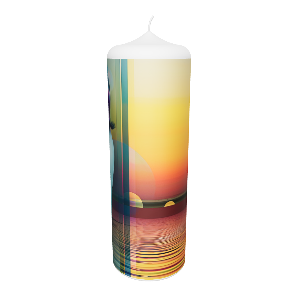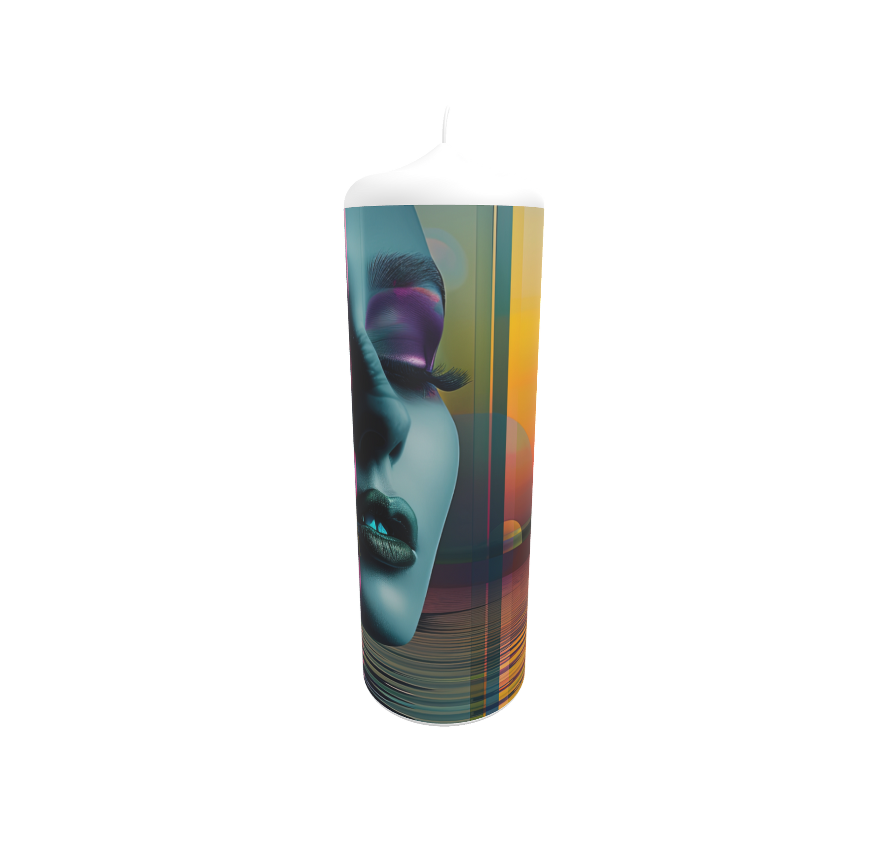 Die Künstlerkerze „Reflexion eines Traums“ verbindet abstrakte Farbflächen mit dem sanften Antlitz einer Figur. Zarte Spiegelungen in Violett, Gold und Türkis verleihen dem Motiv eine träumerische Tiefe. Die harmonische Komposition zwischen Licht und Schatten erzeugt eine poetische Atmosphäre, in der Traum und Wirklichkeit miteinander verschmelzen.