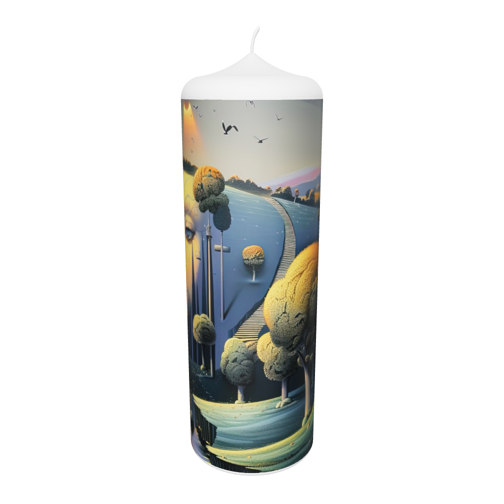 Die Künstlerkerze „Spiegel der Seele“ vereint Porträt und Landschaft zu einem poetischen Symbol innerer Reflexion. Licht und Schatten, Wasser und Himmel verschmelzen zu einer ruhigen Szenerie, in der die Grenzen zwischen Außenwelt und Emotion verschwimmen. Das Werk steht für Tiefe, Selbstbegegnung und die stille Verbindung zwischen Bewusstsein und Natur.