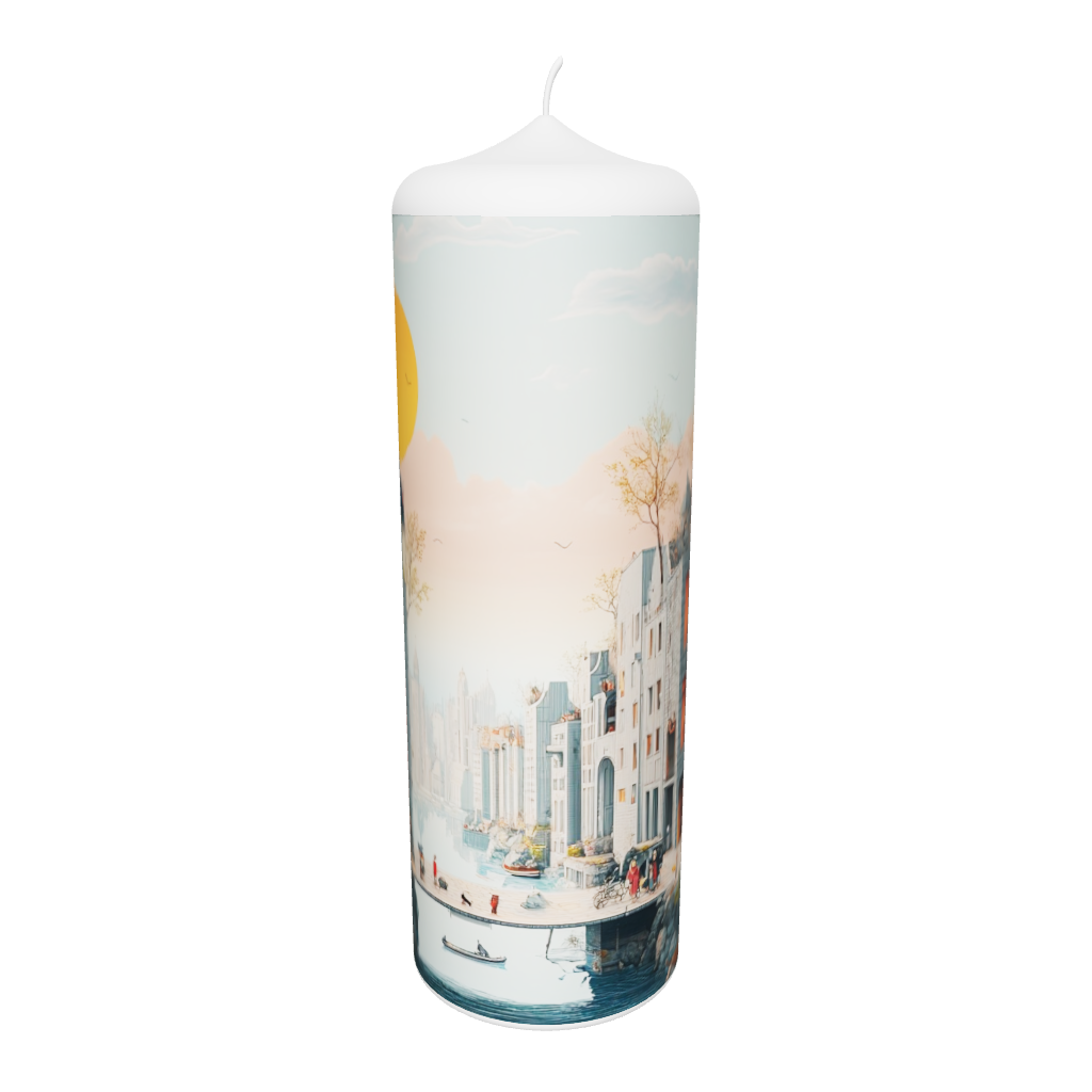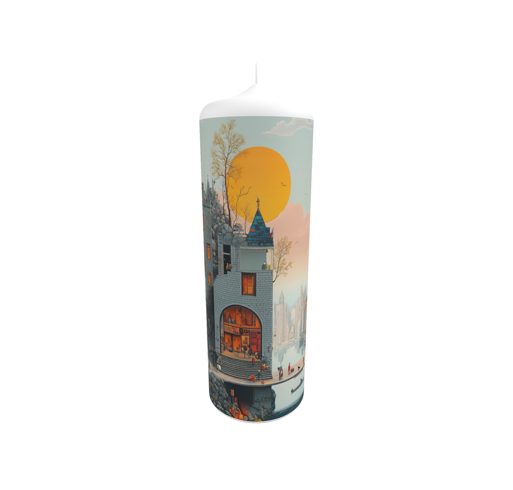 Die Künstlerkerze „Stadt der Spiegelungen“ zeigt eine poetische Stadtszene im warmen Abendlicht. Sanfte Spiegelungen, erleuchtete Fenster und ein goldener Himmel verleihen dem Motiv eine träumerische Ruhe. Architektur und Atmosphäre verschmelzen zu einem stillen Moment urbaner Schönheit – eine Kerze voller Licht und Poesie.