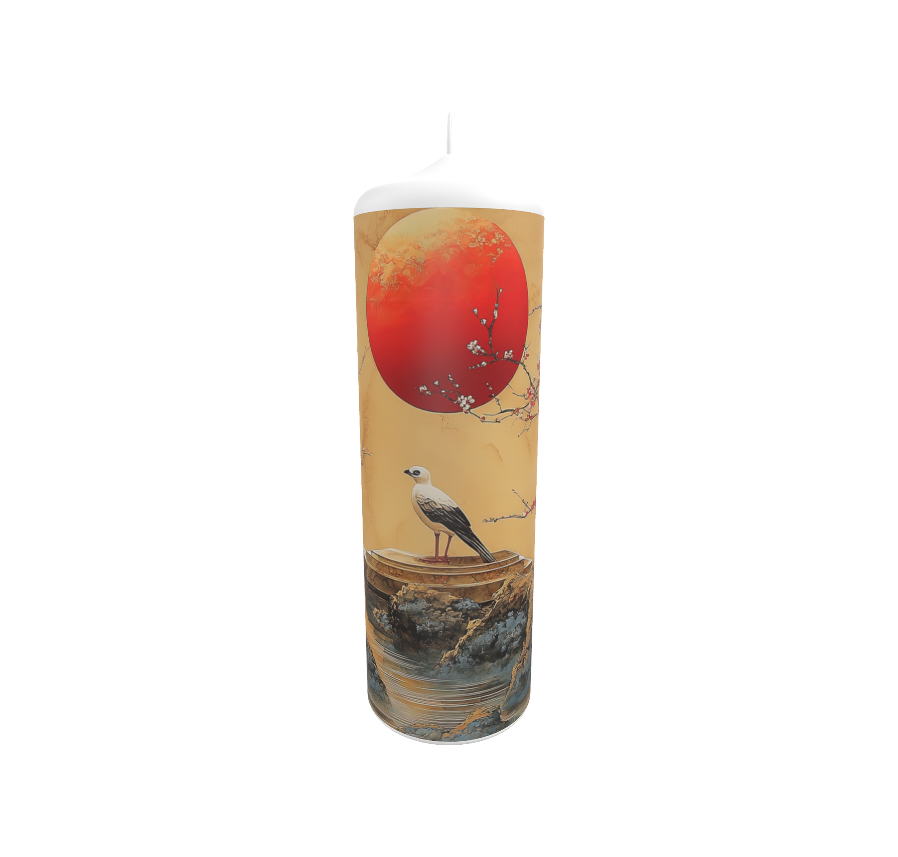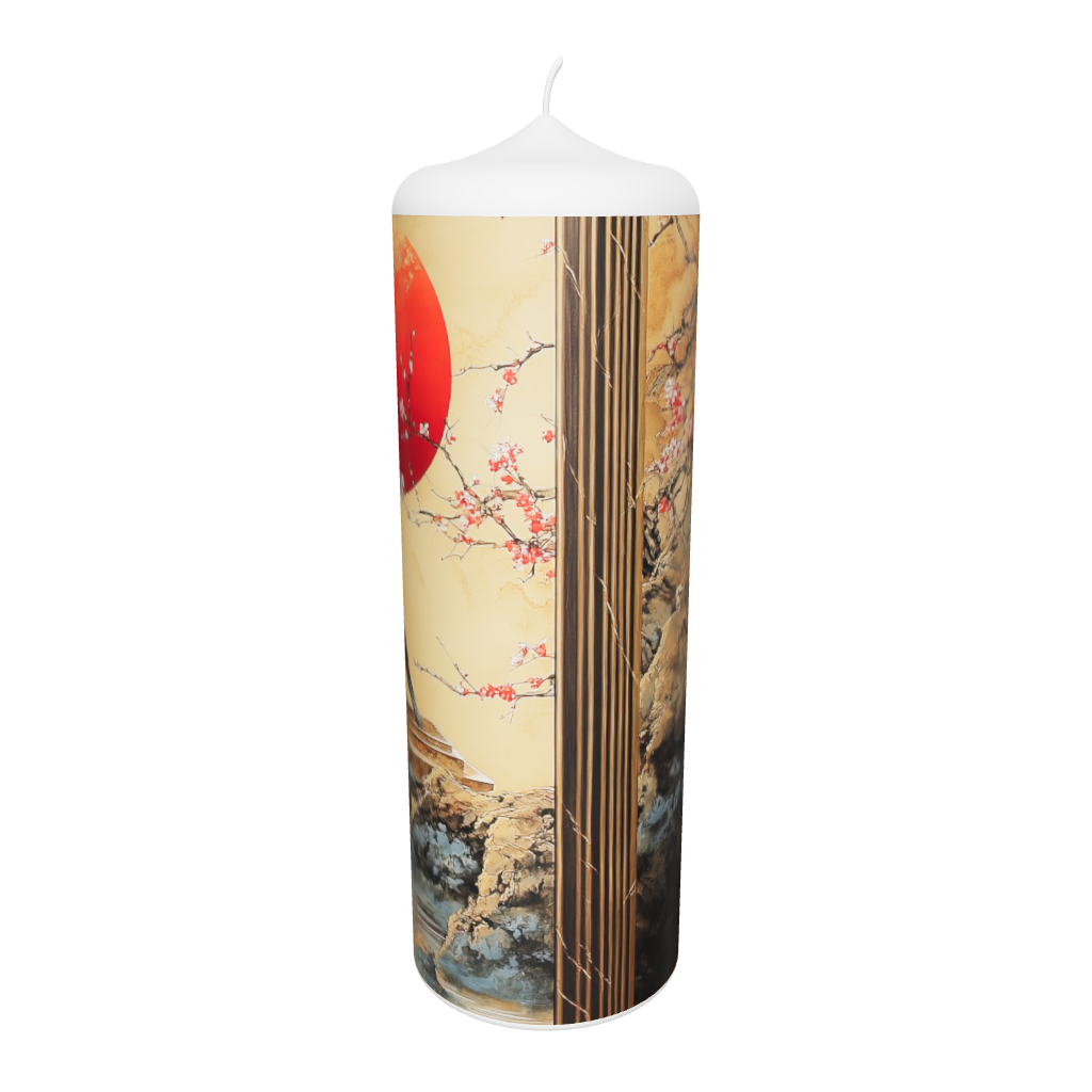 Die Künstlerkerze „Stille Beobachtung“ zeigt eine friedliche Szene aus Natur und Licht: Ein Vogel steht auf einem Felsen unter einem großen, rot leuchtenden Himmelskörper. Die Komposition erinnert an fernöstliche Landschaftsmalerei und lädt zur Ruhe und Achtsamkeit ein – ein Sinnbild stiller Betrachtung und innerer Balance.