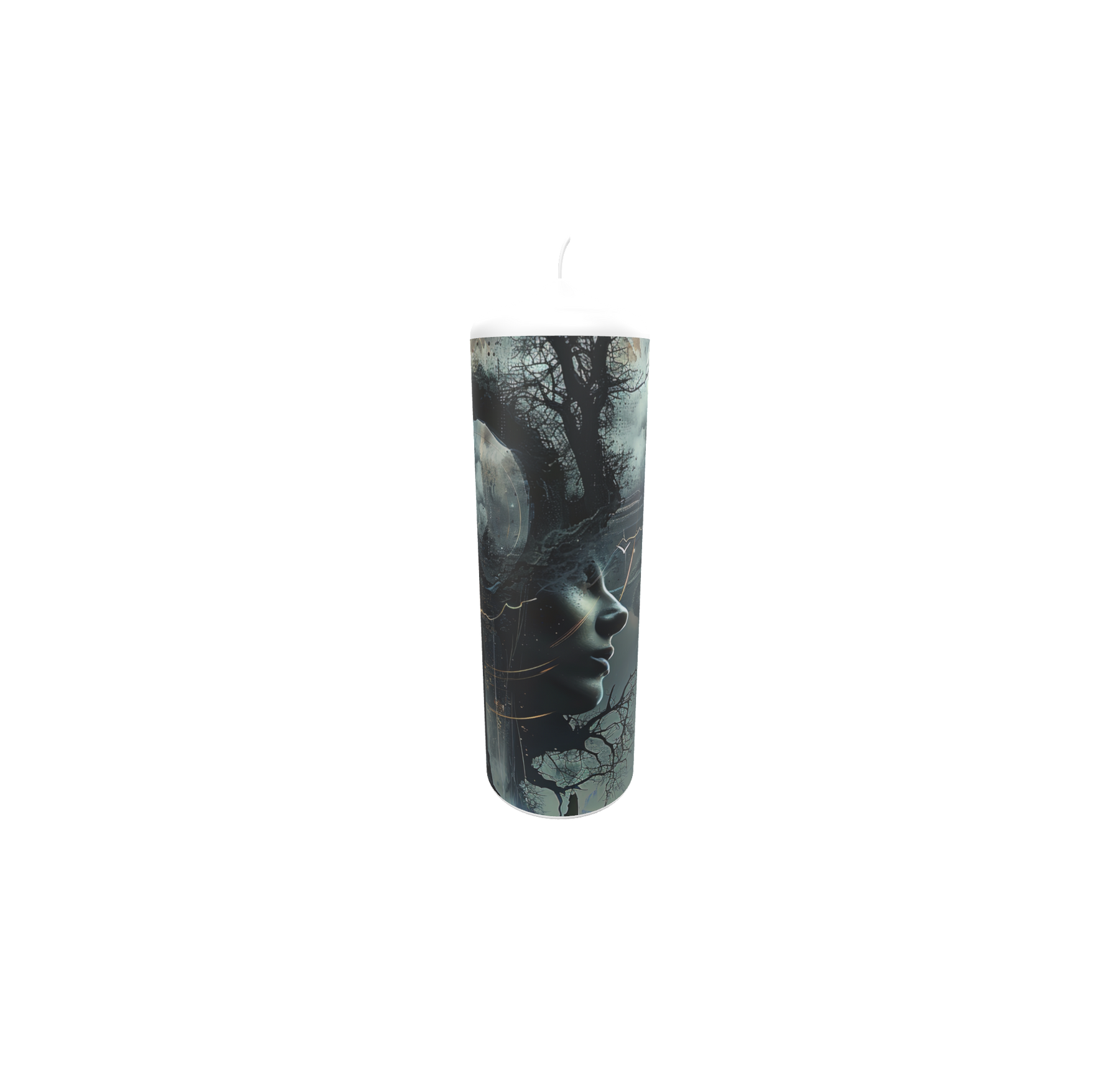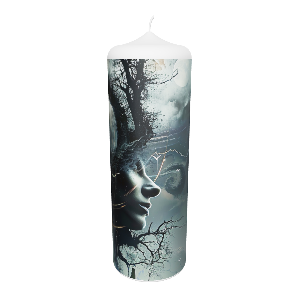 Die Komposition spielt mit Licht und Dunkel, mit Erinnerung und Vergessen. In ihrer ruhigen Symbolik lädt sie zur stillen Betrachtung ein – eine Kerze für Momente der inneren Sammlung und Sehnsucht.