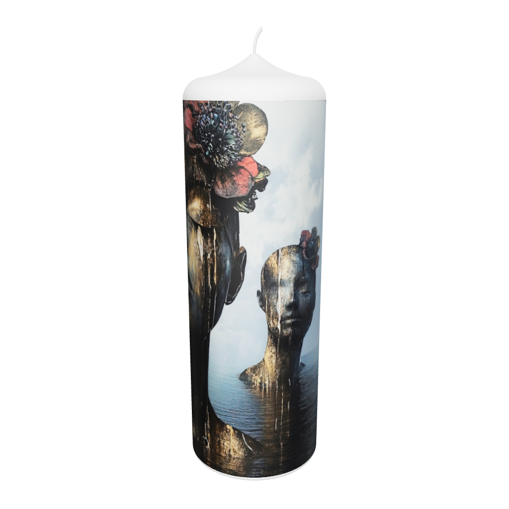 Die Künstlerkerze „Vergänglichkeit im Fluss der Zeit“ zeigt ein ausdrucksvolles Porträt, das mit Wasser- und Farbverläufen verschmilzt. In sanften Tönen von Braun, Grau und Blau entfaltet sich eine stille Symbolik von Erinnerung, Wandel und Loslassen. Ein meditatives Kunstwerk, das Ruhe und Tiefe zugleich ausstrahlt.