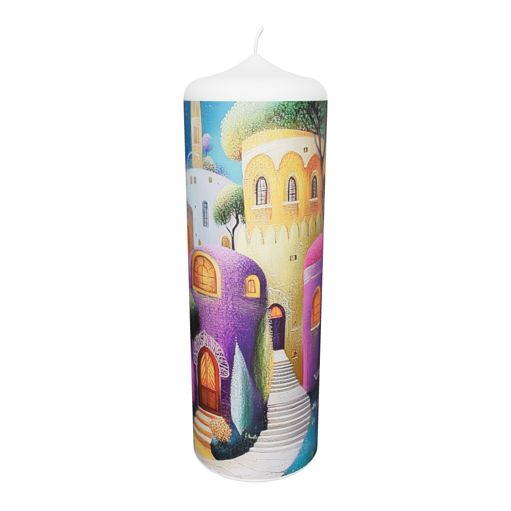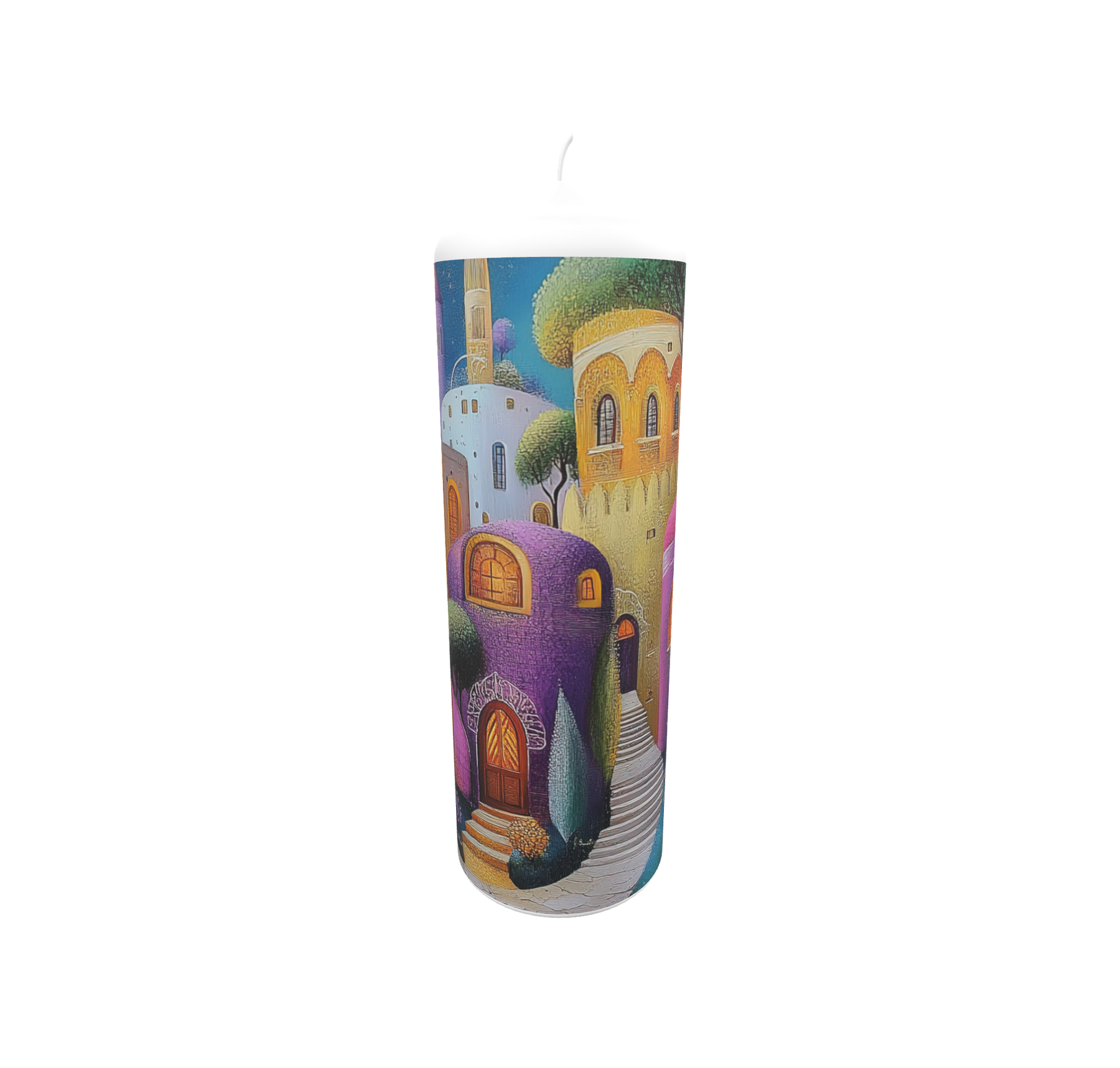 Künstlerkerze mit verspielter Stadtlandschaft in Rosa, Gelb und Violett, inspiriert von Traumsequenzen.