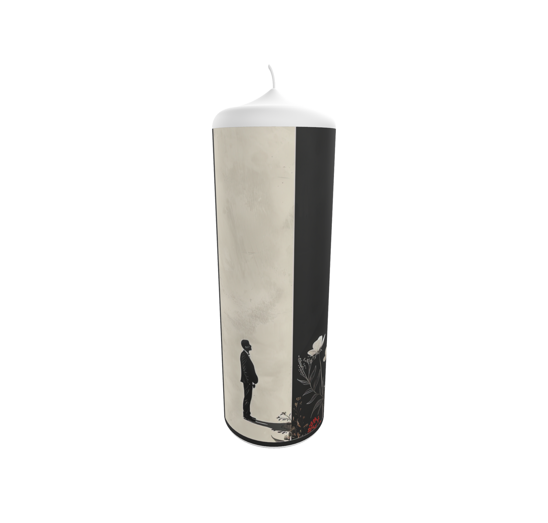„Zwischen Licht und Schatten“ zeigt einen stillen Moment der Selbstbegegnung. Eine einzelne Figur steht am Rand einer dunklen Fläche – zwischen dem hellen Raum des Lichts und dem geheimnisvollen Schatten. Das Werk reflektiert die Balance zwischen Bewusstsein und Unbewusstem, zwischen Nähe und Distanz. Die minimalistische Farbgebung in Schwarz, Weiß und dezentem Rot verstärkt die emotionale Tiefe dieser Komposition. Eine Kerze, die Klarheit und Nachdenklichkeit zugleich ausstrahlt.