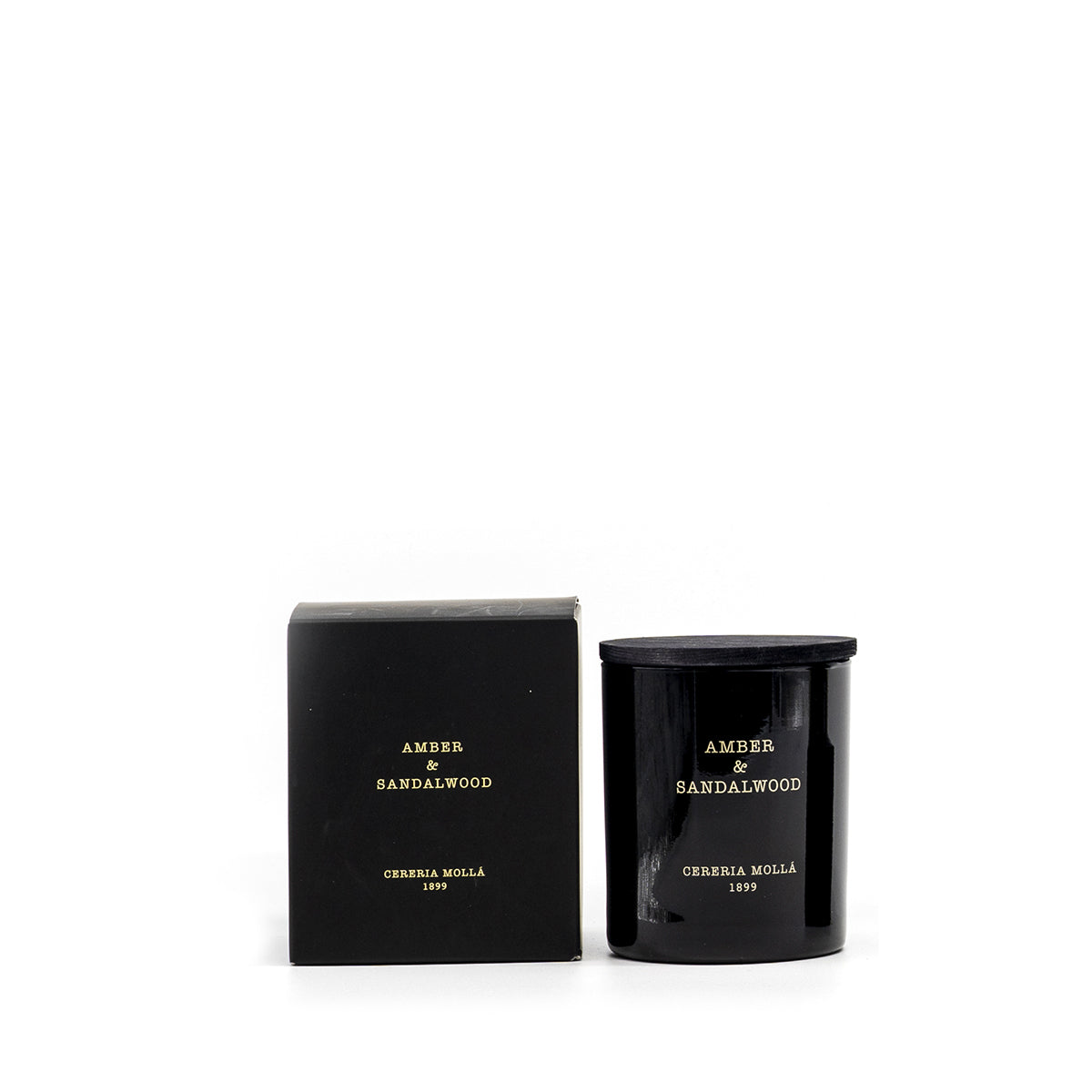 Amber & Sandalwood Duftkerze von Cereria Mollá 1899 mit schwarzer Geschenkbox, handgegossen im Glas mit Holzdeckel und warmem Sandelholzduft.