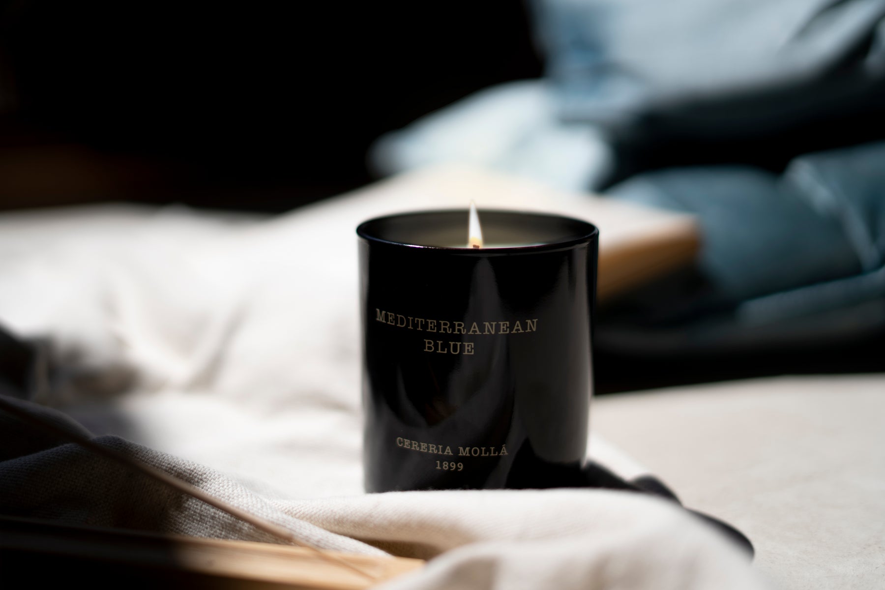 Mediterranean Blue Duftkerze im schwarzen Glas von Cereria Mollá 1899, brennend auf heller Stoffdecke mit weichem Licht – Duftmoment voller Ruhe und Meeresfrische.