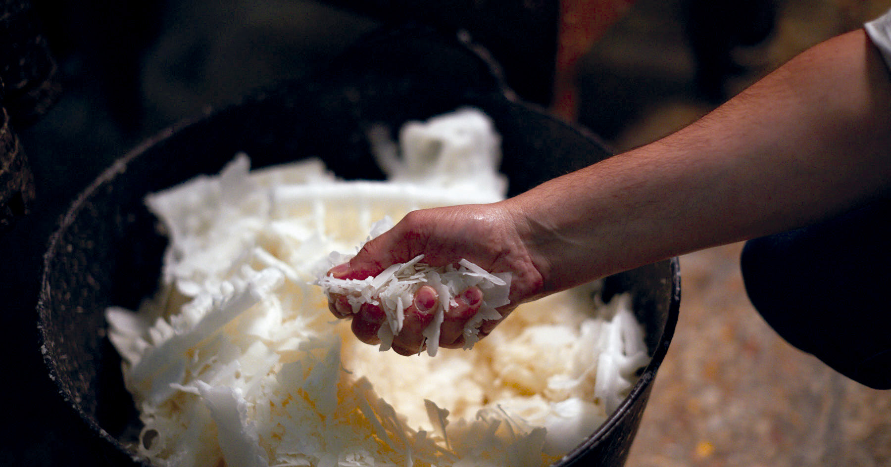 Hand hält weiße Wachsflocken während der handwerklichen Kerzenherstellung, Symbol für traditionelle Fertigung und Qualität bei Cereria Mollá 1899.