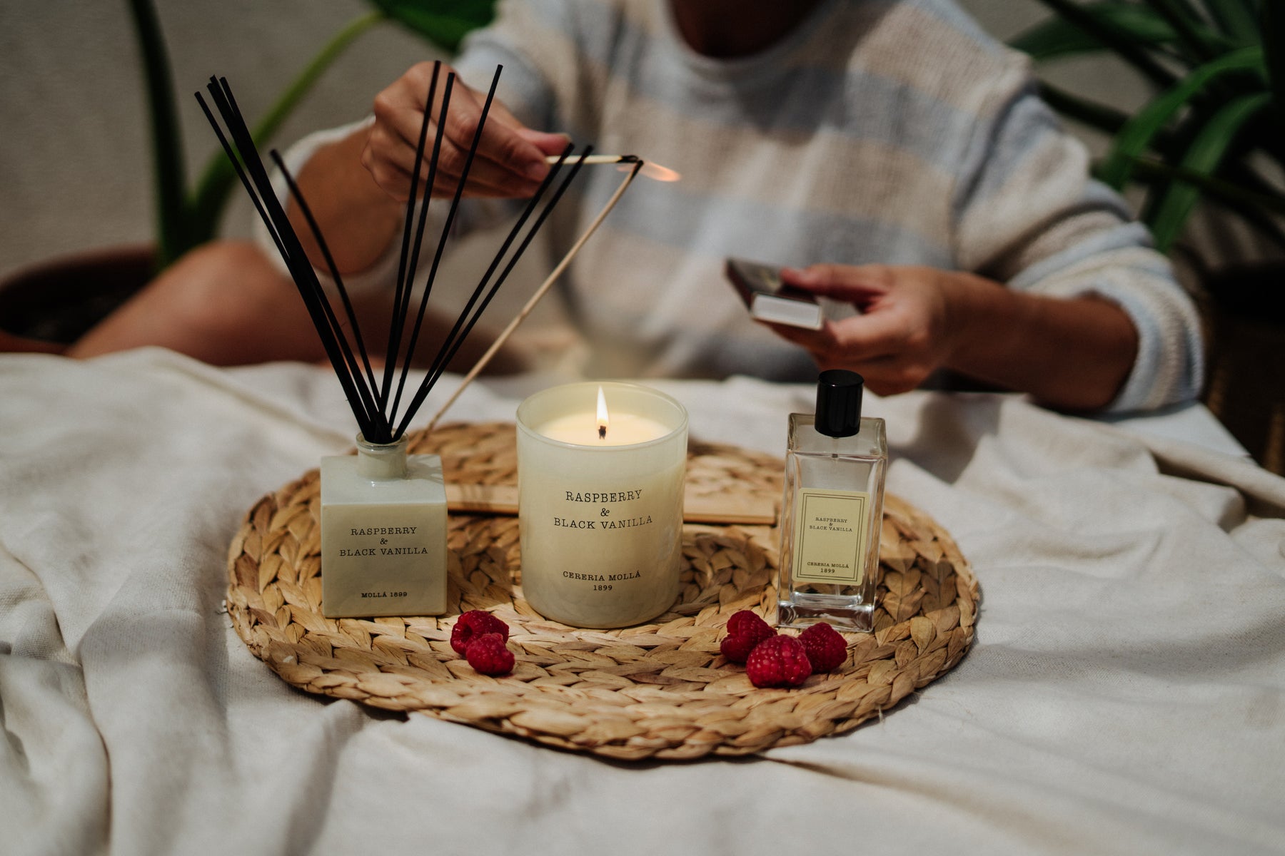 Raspberry & Black Vanilla Duftkerze von Cereria Mollá 1899, angezündet auf Basttablett mit frischen Himbeeren, Raumduft und Parfum, gemütliche Stimmung im Kerzenlicht.