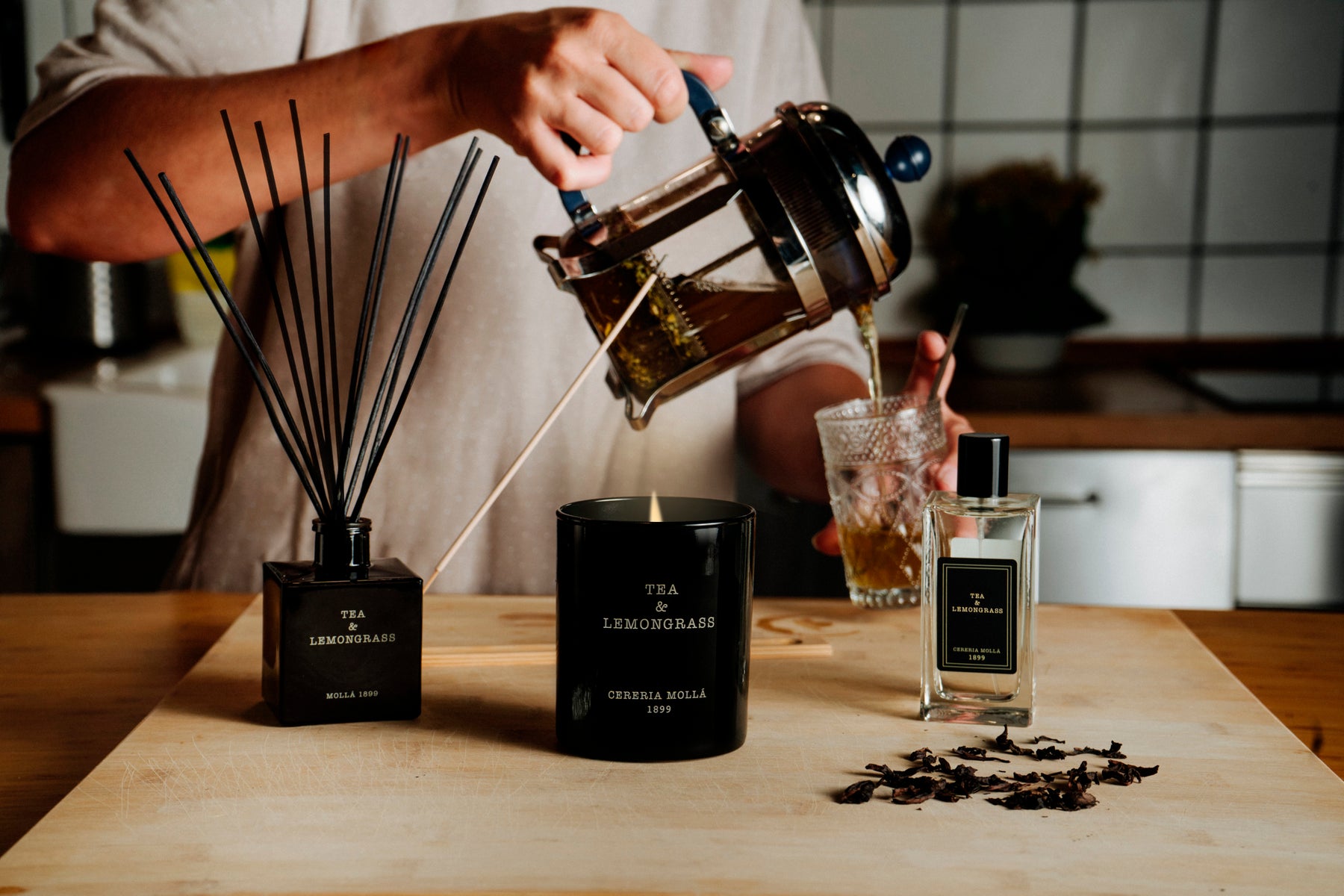 Tea & Lemongrass Kollektion von Cereria Mollá 1899 mit Duftkerze, Diffusor und Raumduft auf Holztisch, im Hintergrund frischer Tee in Glas gegossen.