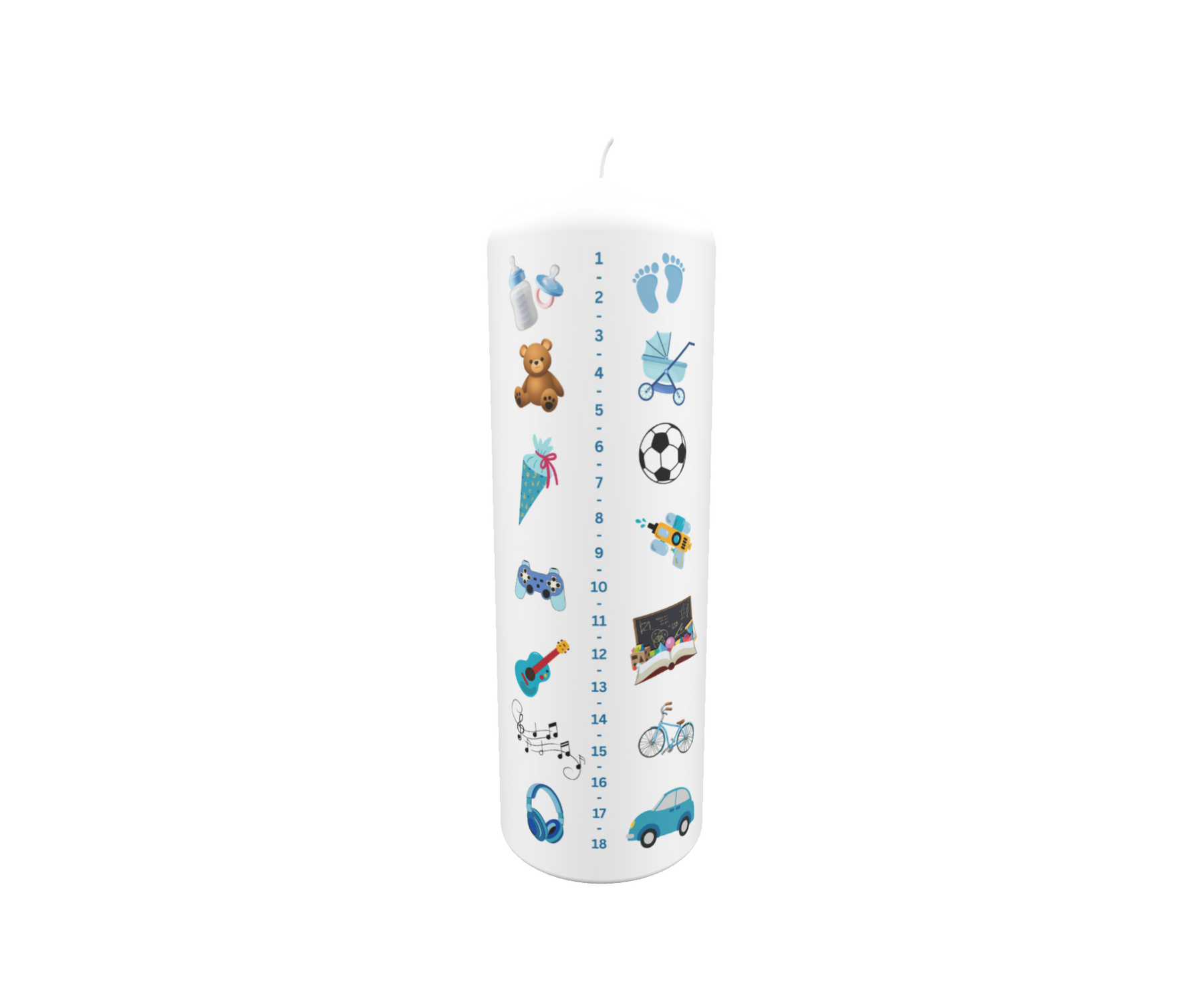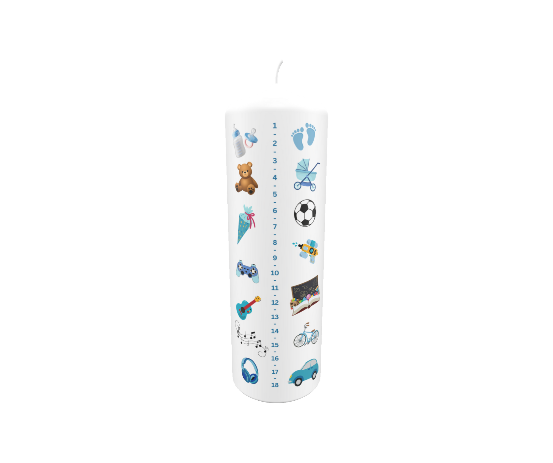 Lebenslicht für Jungen mit Messskala und Symbolen – Babyflasche, Bär, Auto, Fußball, Schulanfang