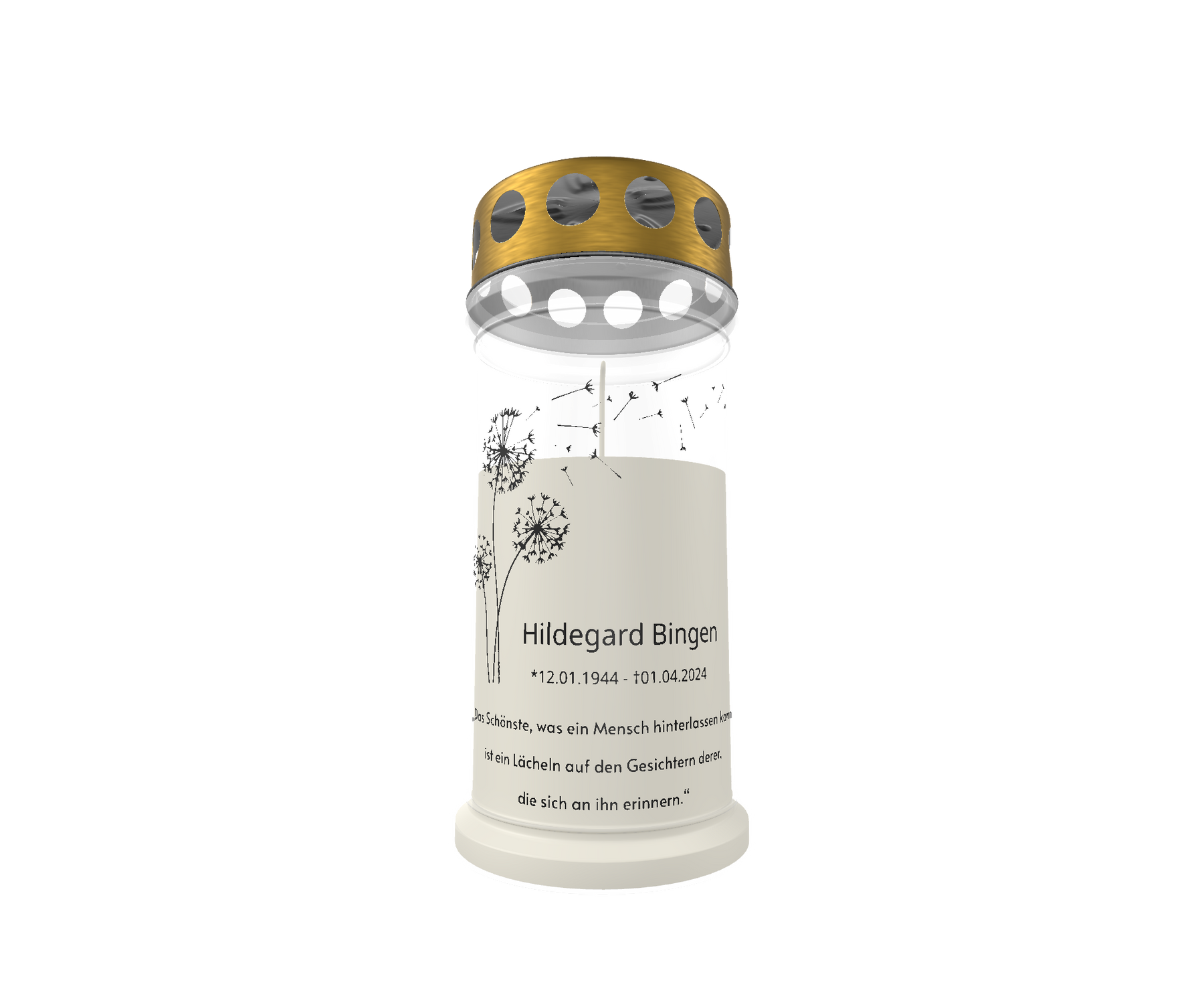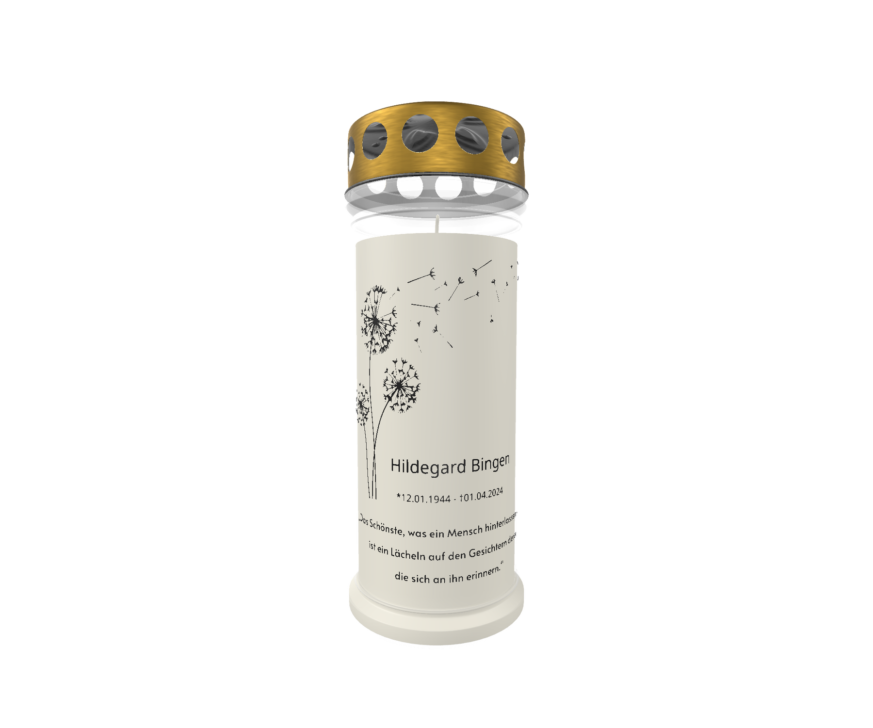 Gedenkkerze mit Löwenzahn-Motiv und Name „Hildegard Bingen“, goldener Deckel, zartes Zitat über Erinnerung – Symbol für Liebe und Vergänglichkeit.