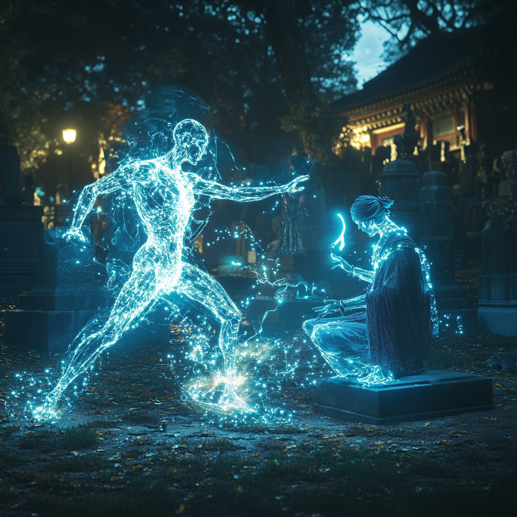 Leuchtende Energiegestalten in einem nächtlichen Tempelgarten – eine Figur steht kämpferisch, die andere sitzt meditativ, beide aus blauer Energie geformt.