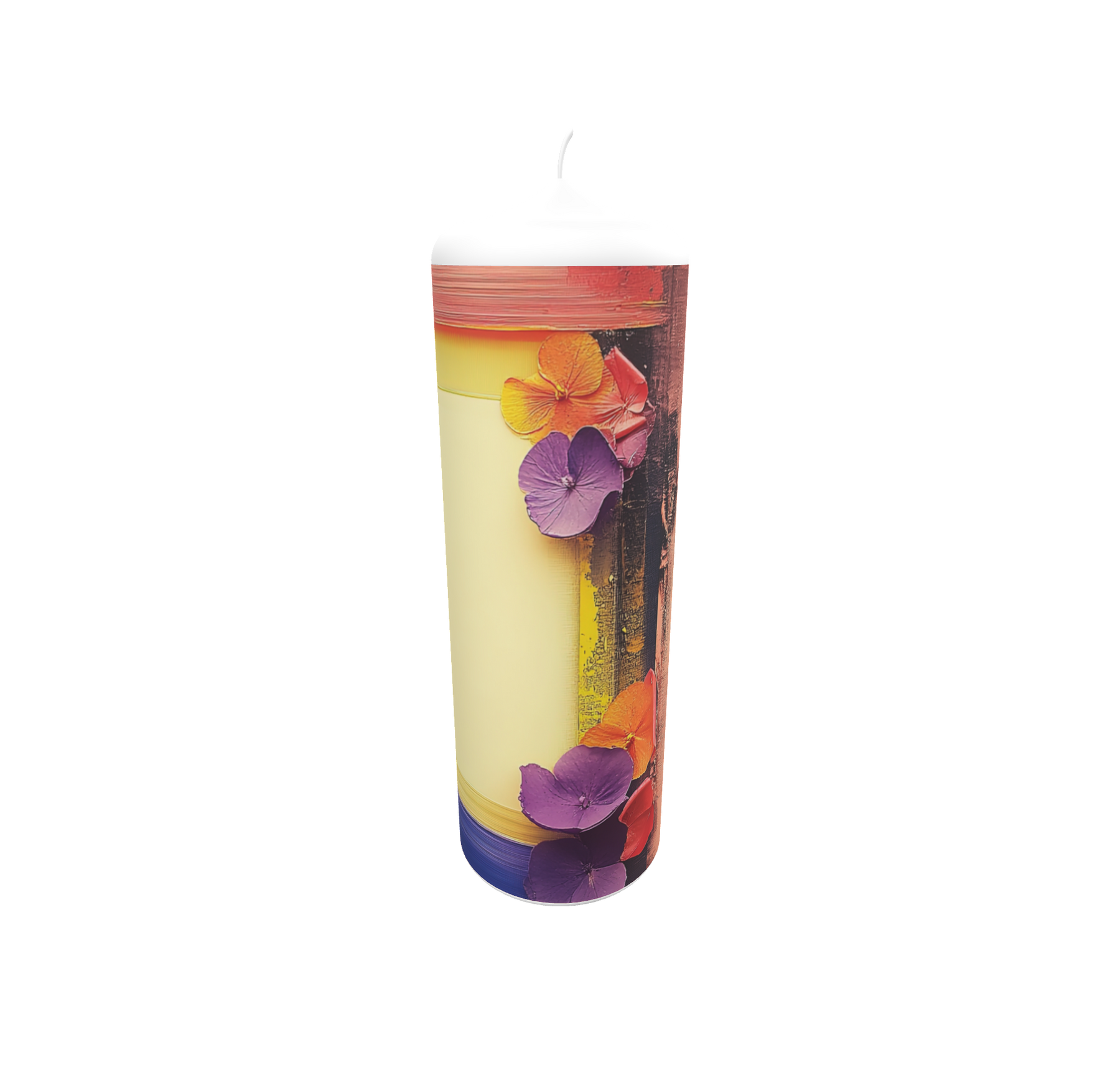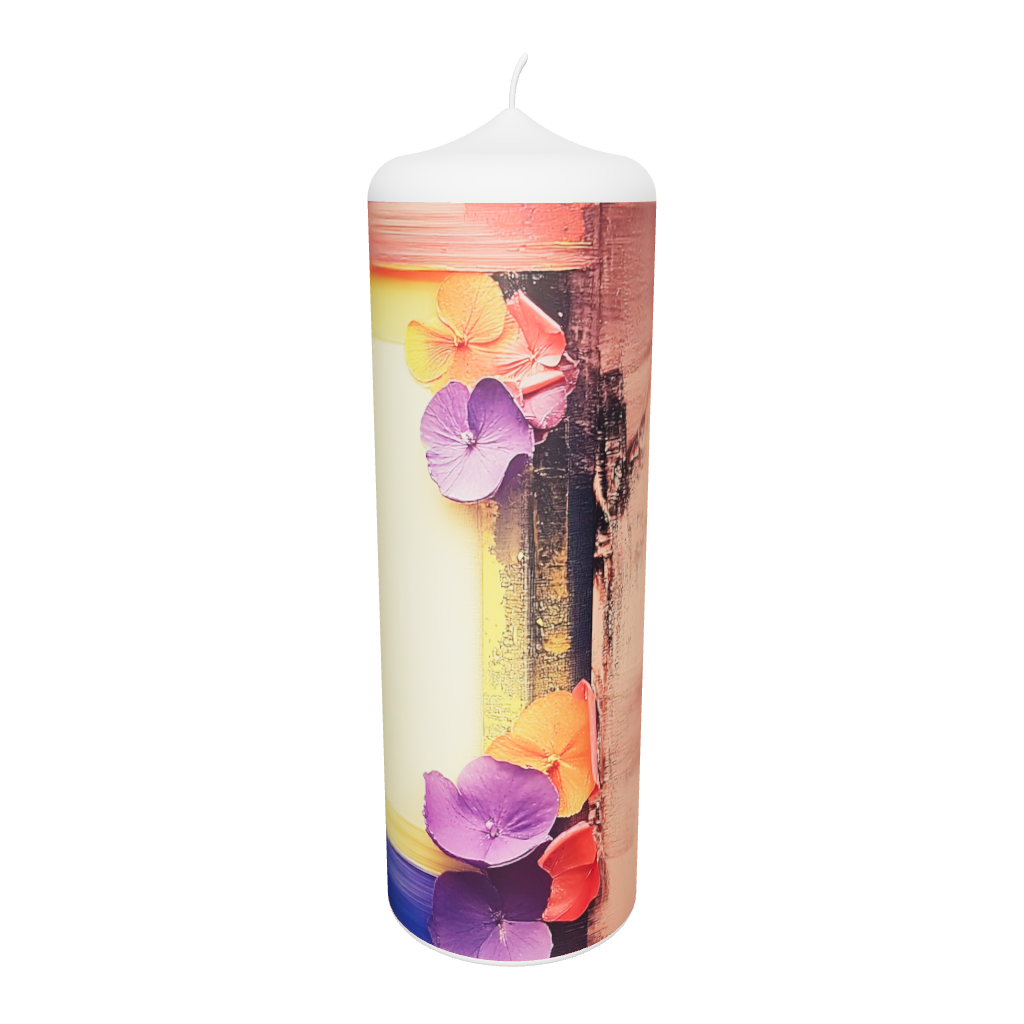 Die Künstlerkerze „Blühender Rahmen“ vereint florale Eleganz mit klassischer Formensprache. Umgeben von sanften Blüten in Violett und Orange entsteht eine harmonische Komposition, die an barocke Rahmenelemente erinnert. Eine Kerze voller Anmut und Ruhe – ein kleines Kunstwerk für farbenreiche Akzente.