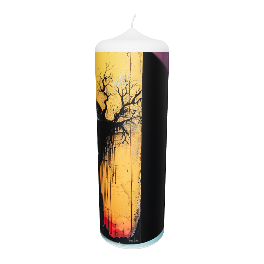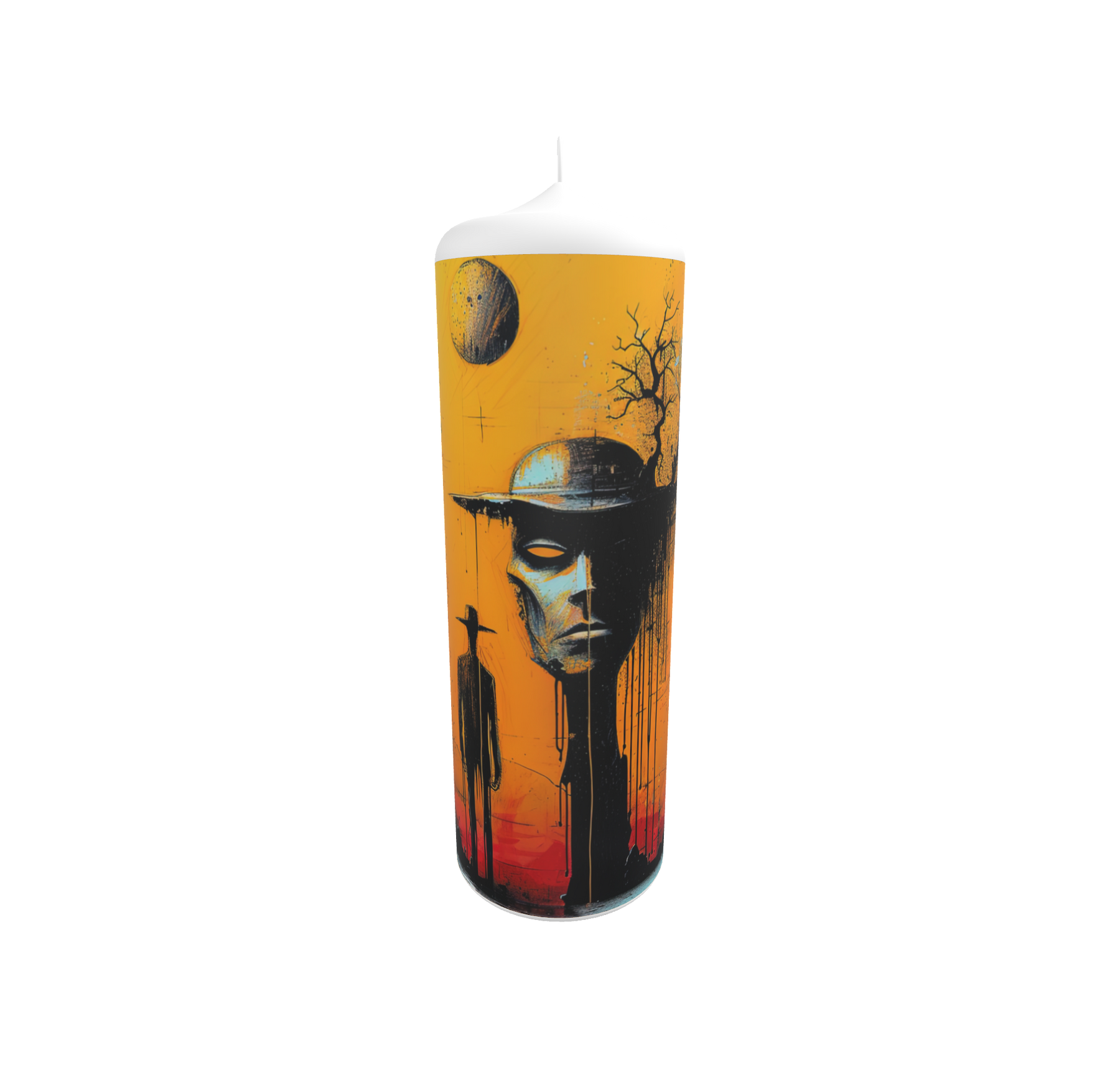 Die Künstlerkerze „Der stille Beobachter“ zeigt eine abstrakte Figur im goldenen Licht einer surrealen Mondlandschaft. In warmen Tönen zwischen Gelb, Orange und Schwarz entfaltet sich ein Sinnbild für Achtsamkeit, Stille und das Nachdenken über Zeit und Raum. Eine Kerze für Momente der inneren Betrachtung.