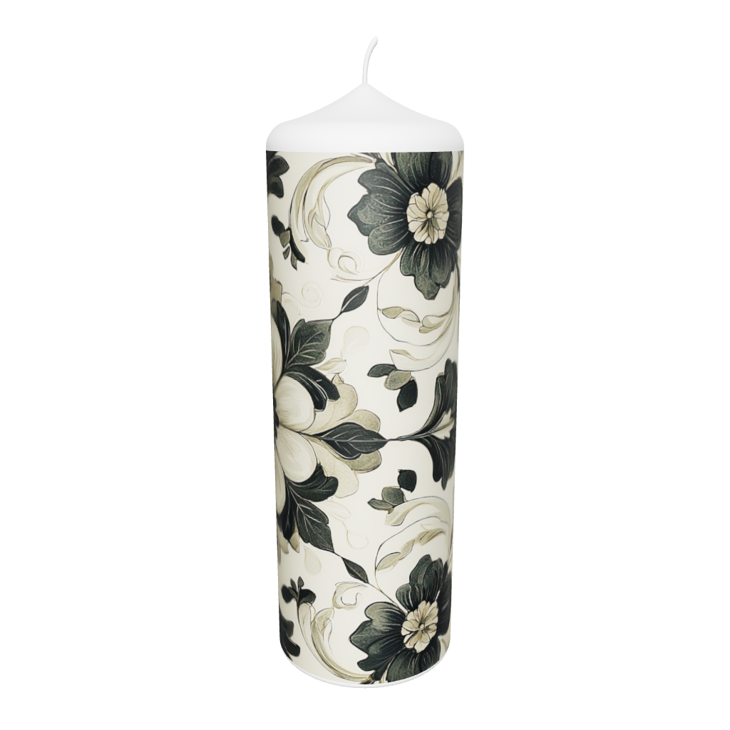 Diese Künstlerkerze trägt das Motiv „Florale Symmetrie“. Das stilisierte Blumenornament in Schwarz-Weiß vereint Harmonie, Klarheit und Eleganz. Das symmetrische Design steht für Balance und Ruhe – eine zeitlose Dekorkerze mit kunstvollem Charakter, perfekt für moderne Wohnräume.