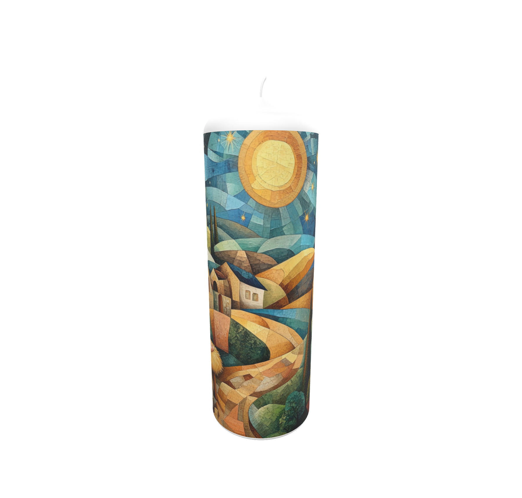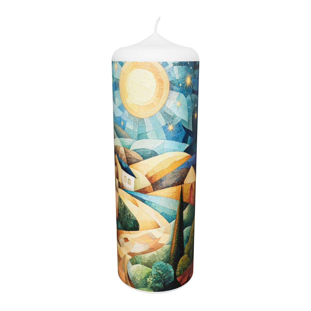 Diese Künstlerkerze zeigt das Motiv „Geburt Sternenlicht“. Eine warme, leuchtende Komposition aus Sonne, Hügeln und Himmelskörpern symbolisiert Neubeginn, Schutz und Licht. Das harmonische Farbspiel aus Blau, Gold und Ocker schafft eine friedvolle Atmosphäre – ideal zur Geburt oder als Geschenk mit Bedeutung.
