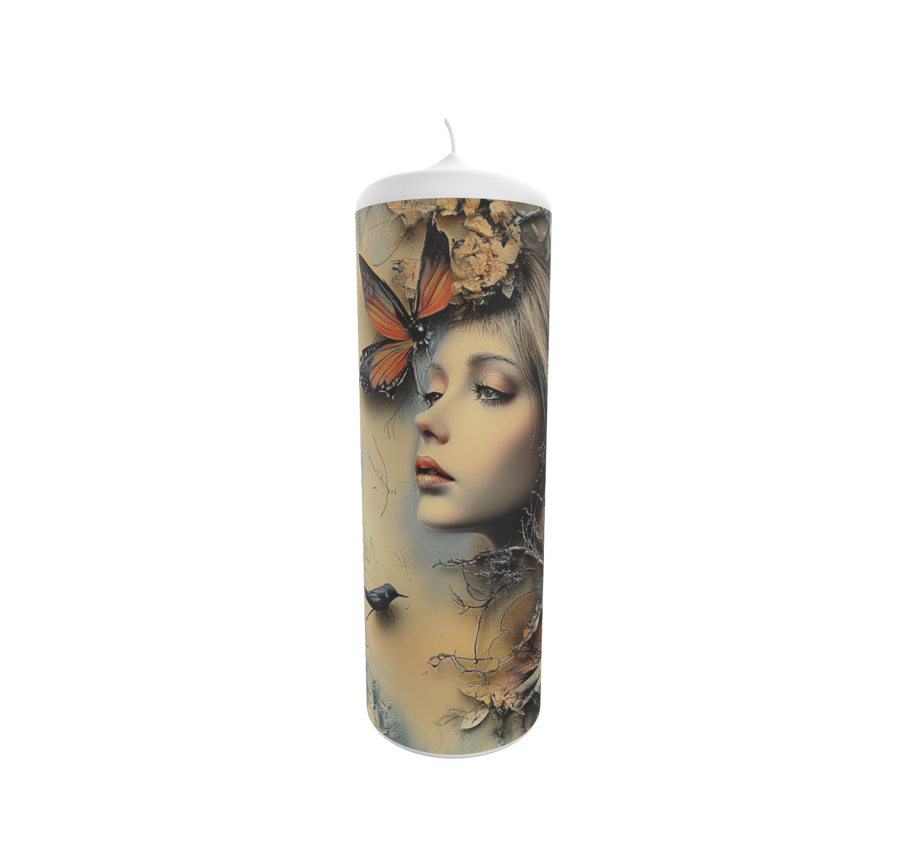 Künstlerkerze mit Frauenporträt, Schmetterling und sanften Naturmotiven in warmem Licht.