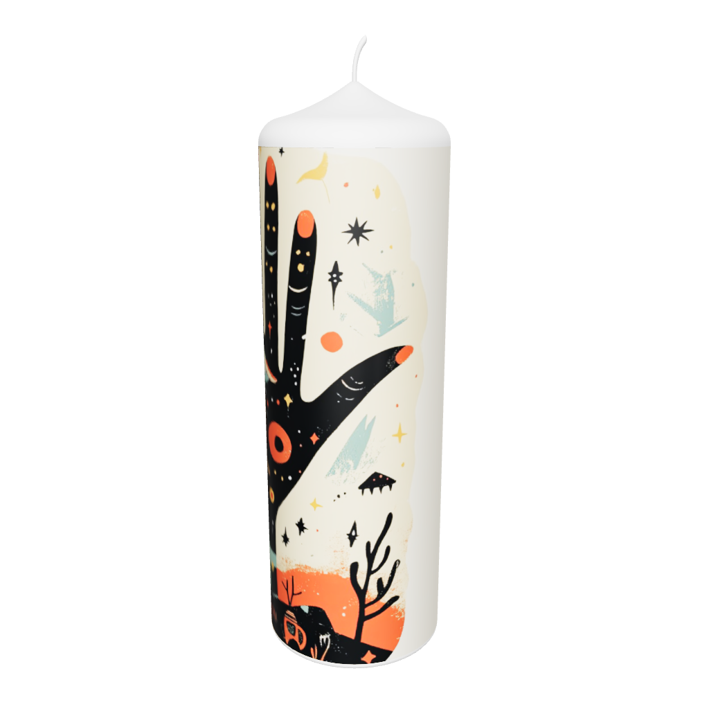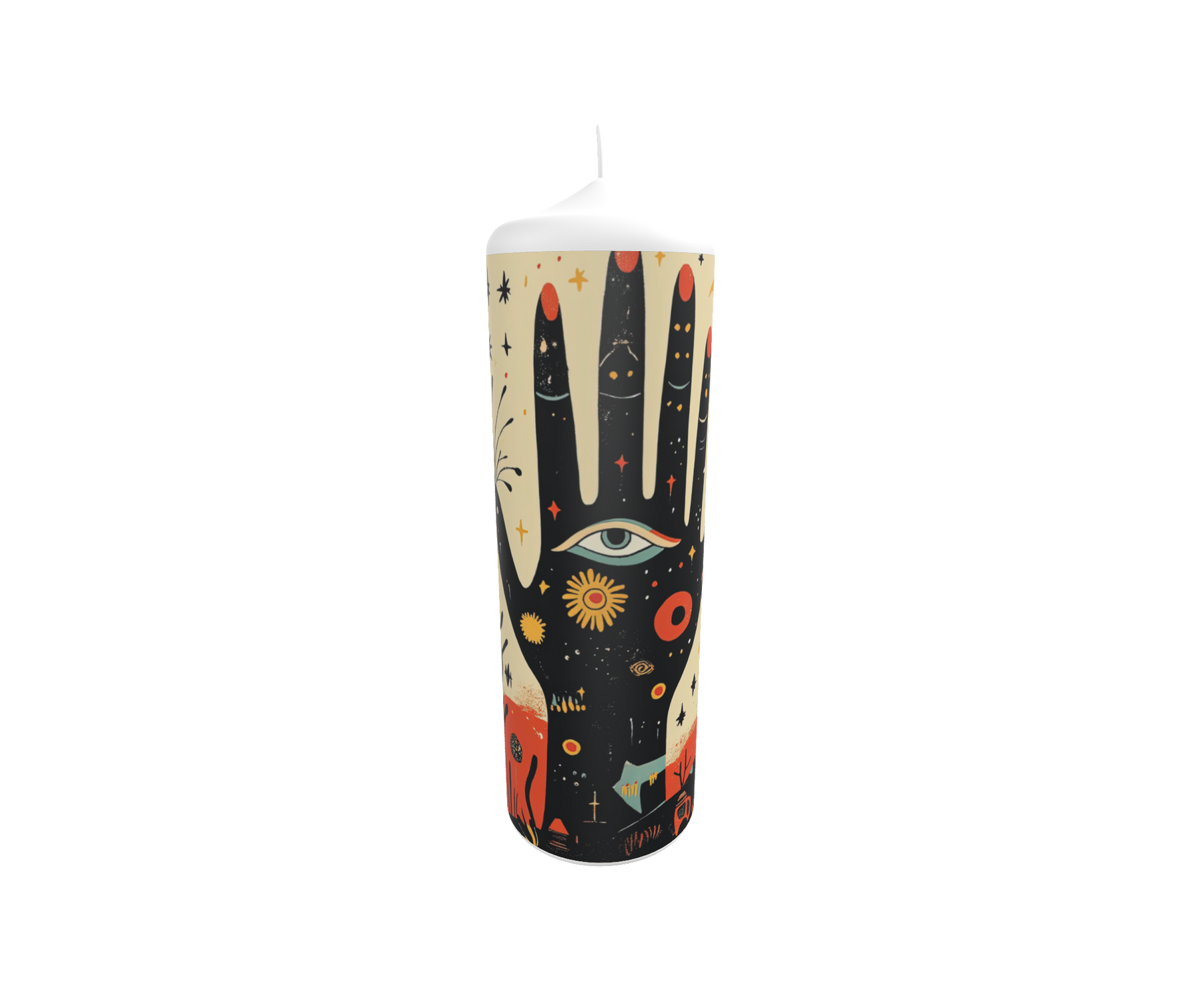 Diese Künstlerkerze zeigt das Motiv einer kosmischen Hand – ein faszinierendes Zusammenspiel aus Symbolik, Mystik und moderner Grafik. Sterne, Sonne, Mond und das allsehende Auge stehen für Schutz, Energie und spirituelle Kraft. Eine außergewöhnliche Kerze für Menschen, die das Geheimnisvolle lieben.