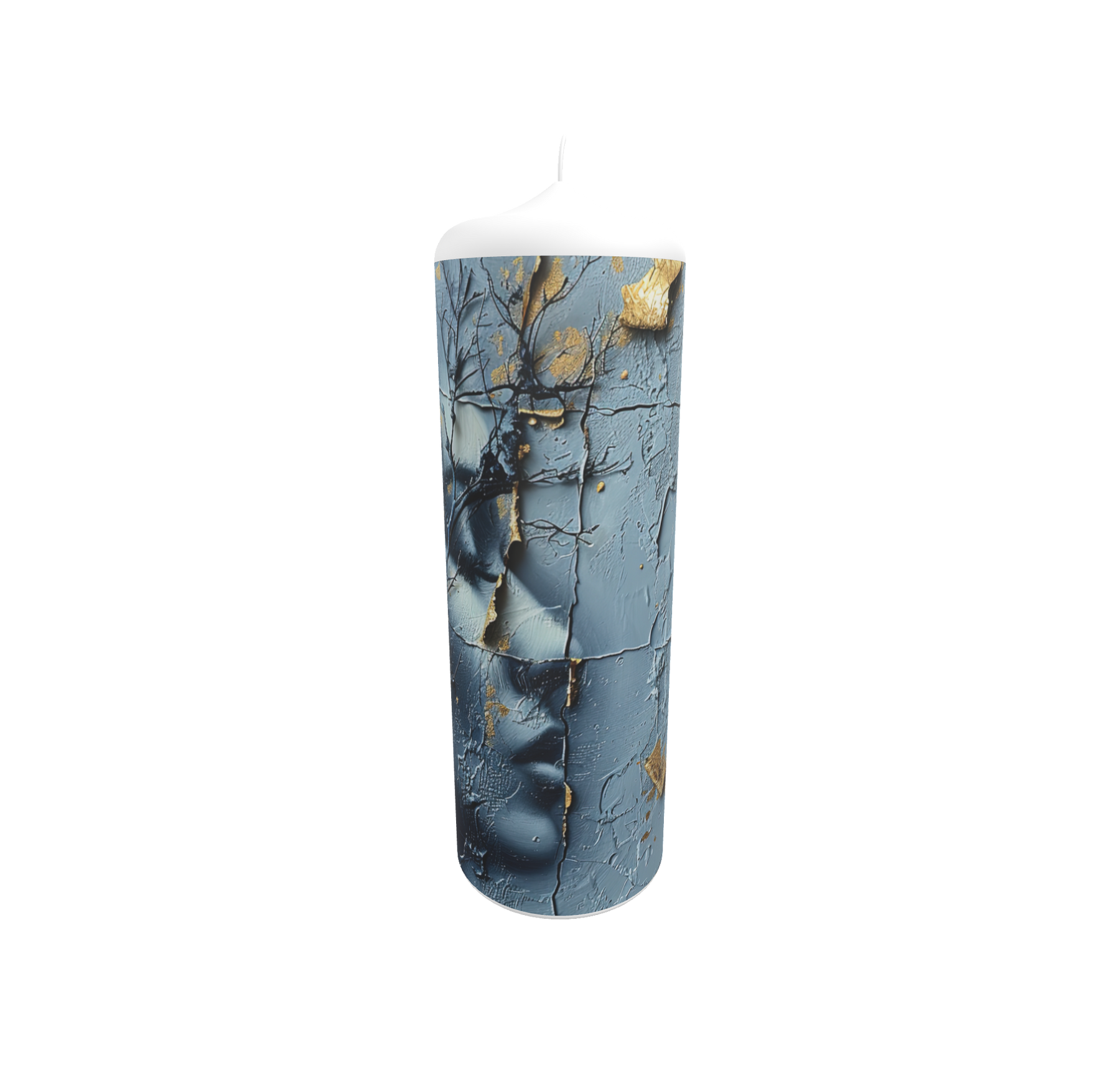 „Licht und Schatten“ spielt mit der feinen Balance zwischen Helligkeit und Dunkelheit. Das Werk zeigt eine geheimnisvolle Figur, deren Umrisse im Wechselspiel aus Lichtreflexen, Glasstrukturen und goldenen Akzenten verschwimmen. Diese Kerze ist eine Hommage an die Dualität des Lebens – an Klarheit und Tiefe, an Verbergen und Erkennen. Das Zusammenspiel aus kühlem Grau und warmem Gold verleiht ihr eine zeitlose Eleganz und ruhige Ausdruckskraft.