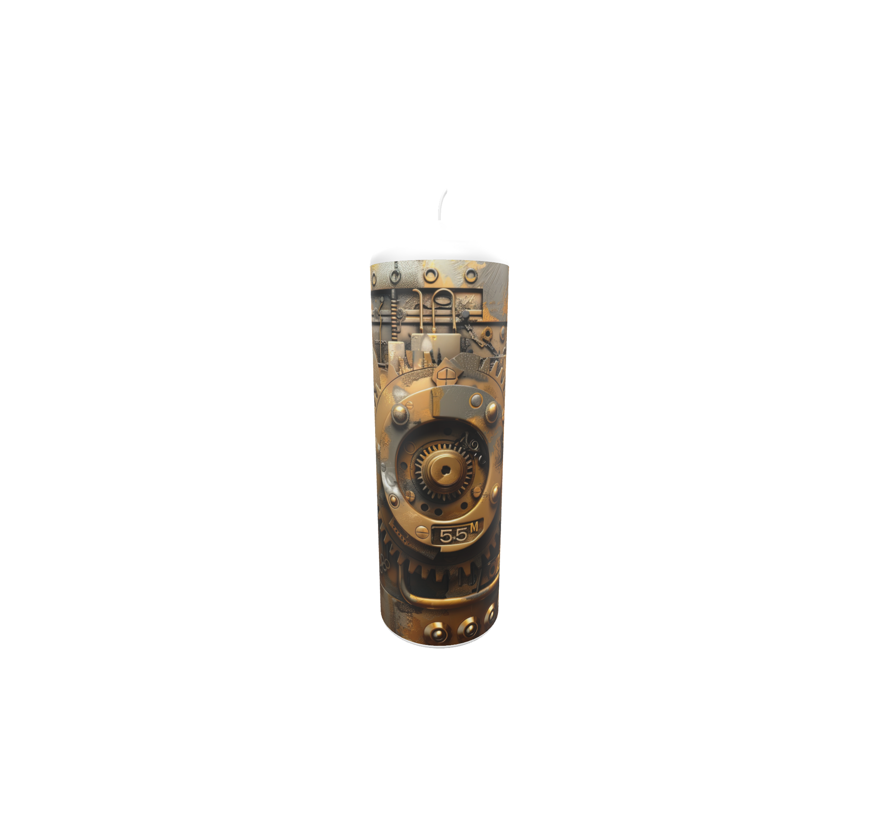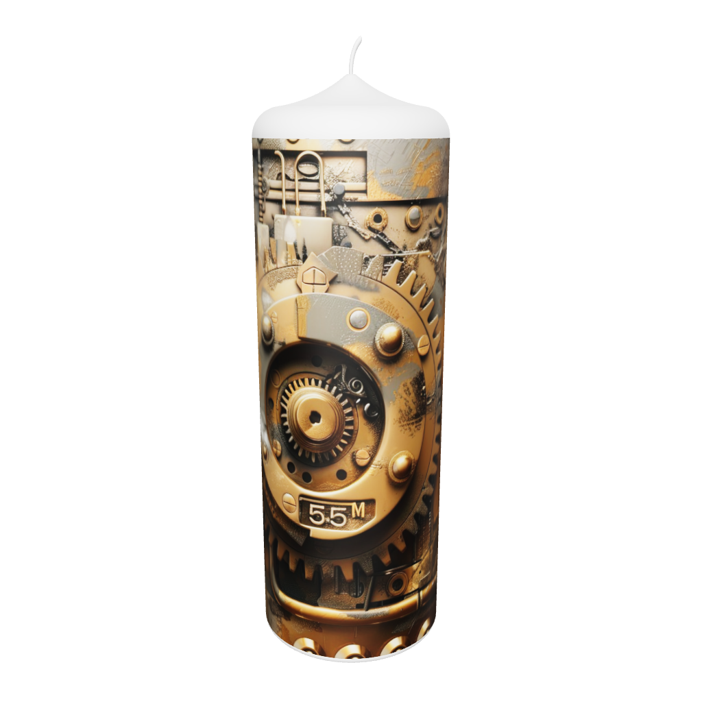 Die Künstlerkerze „Mechanik der Zeit“ zeigt ein detailreiches Zahnradmotiv mit antiker Uhr. Das Design verbindet Mechanik und Symbolik – ein Sinnbild für Zeit, Wandel und Präzision. In warmen Gold- und Brauntönen gestaltet, wirkt sie nostalgisch und zugleich kraftvoll – ein Kunstwerk mit Tiefe.