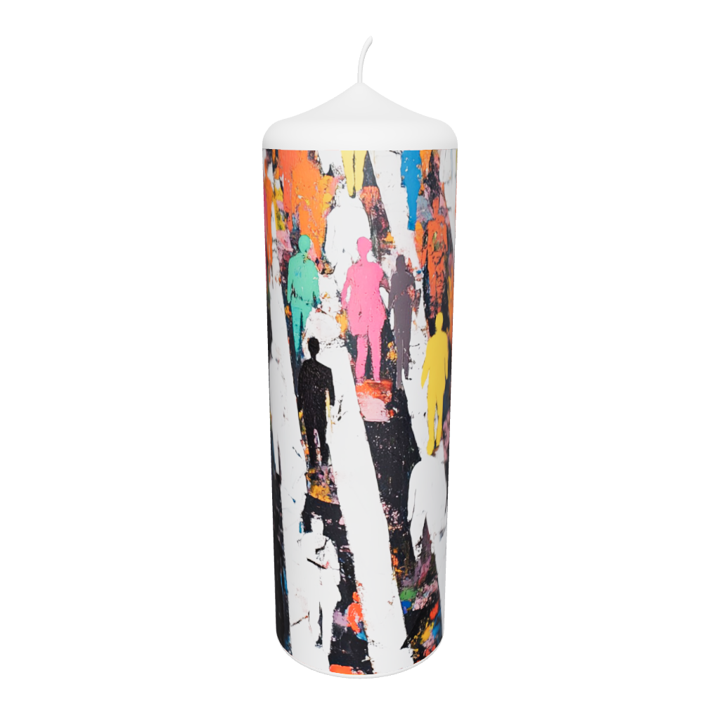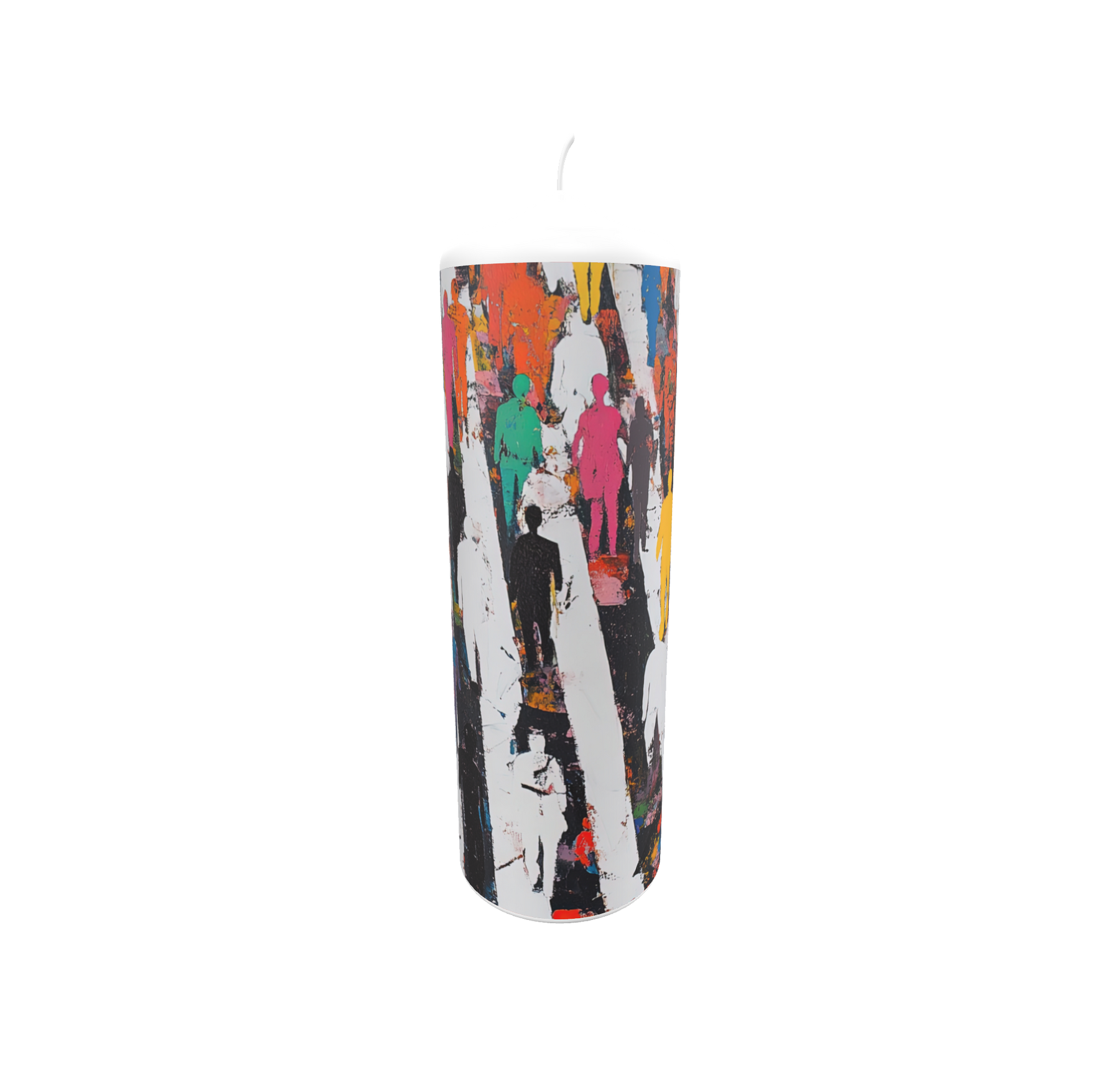 Diese Künstlerkerze zeigt das Motiv „Menschenstrom Urban“. Dynamische Figuren in kräftigen Farben bewegen sich durch abstrakte Straßenformen – Sinnbild für Bewegung, Vielfalt und modernes Stadtleben. Eine künstlerische Kerze mit energiegeladener, urbaner Ausstrahlung.