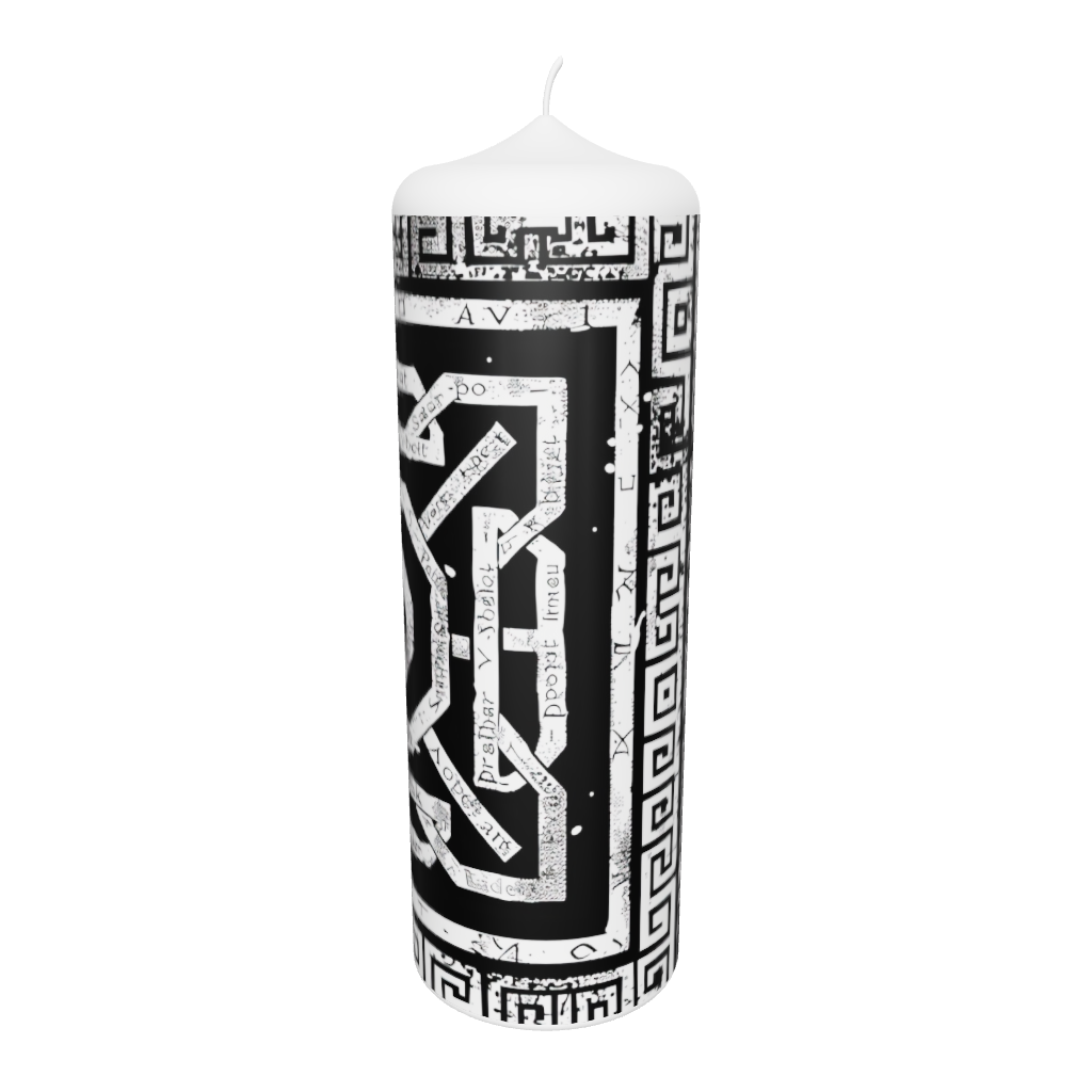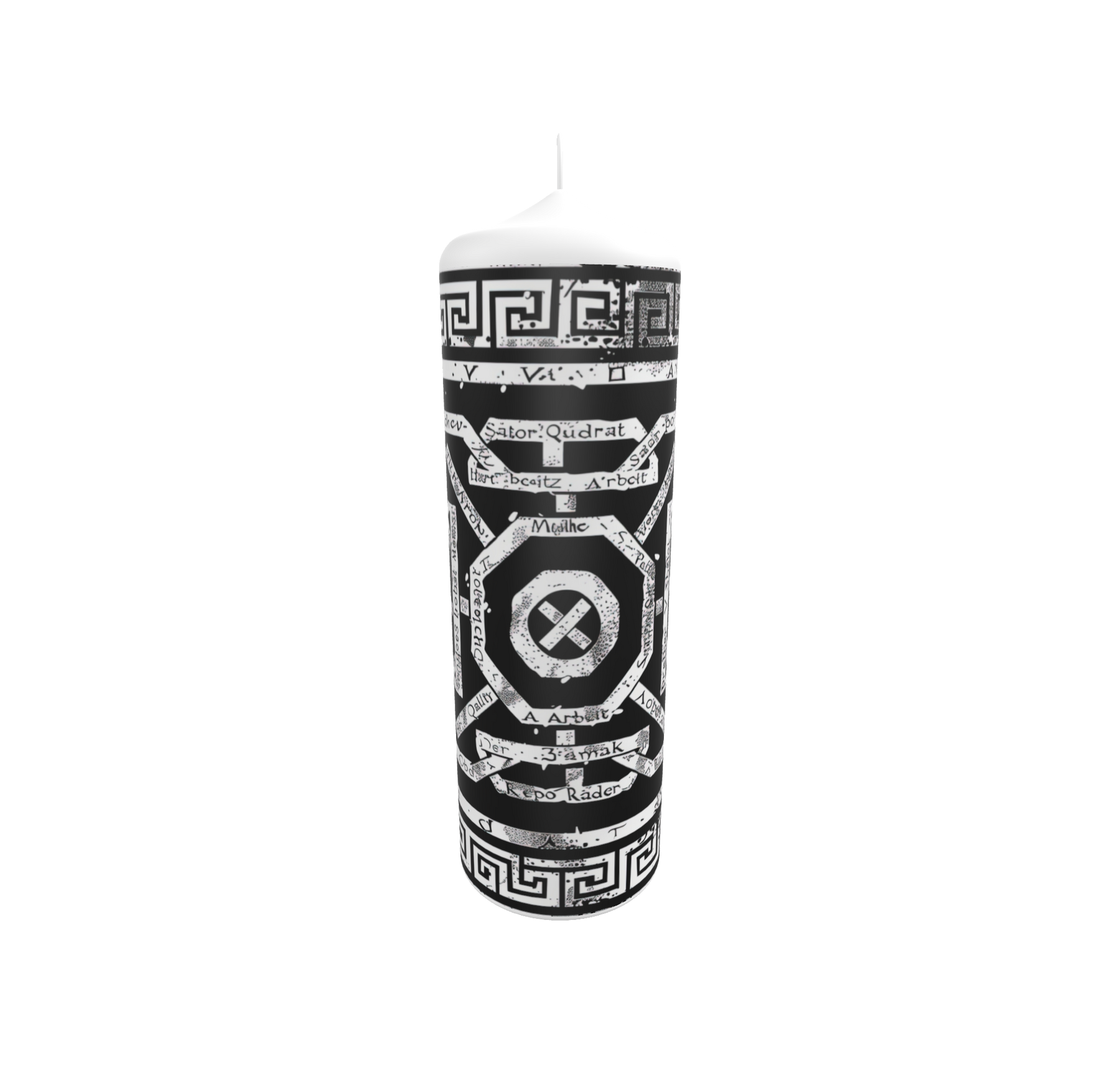 Künstlerkerze mit typografischem Sator-Quadrat und geometrischem Labyrinthmuster – symbolisches Design in Schwarz-Weiß mit spirituellem Charakter.