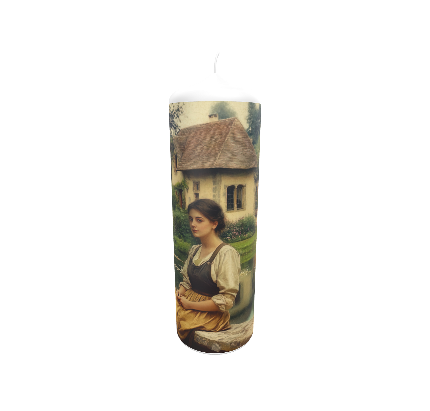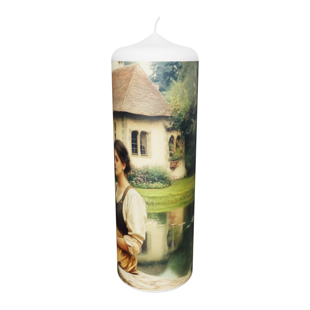 Die Künstlerkerze „See der Ruhe“ zeigt eine stille, harmonische Szenerie: Eine junge Frau sitzt am Seeufer vor einem alten Haus – ein Moment der Einkehr und Gelassenheit. Sanfte Farben und klassischer Malstil verleihen dieser Kerze eine poetische Ruhe, die an vergangene Zeiten erinnert.