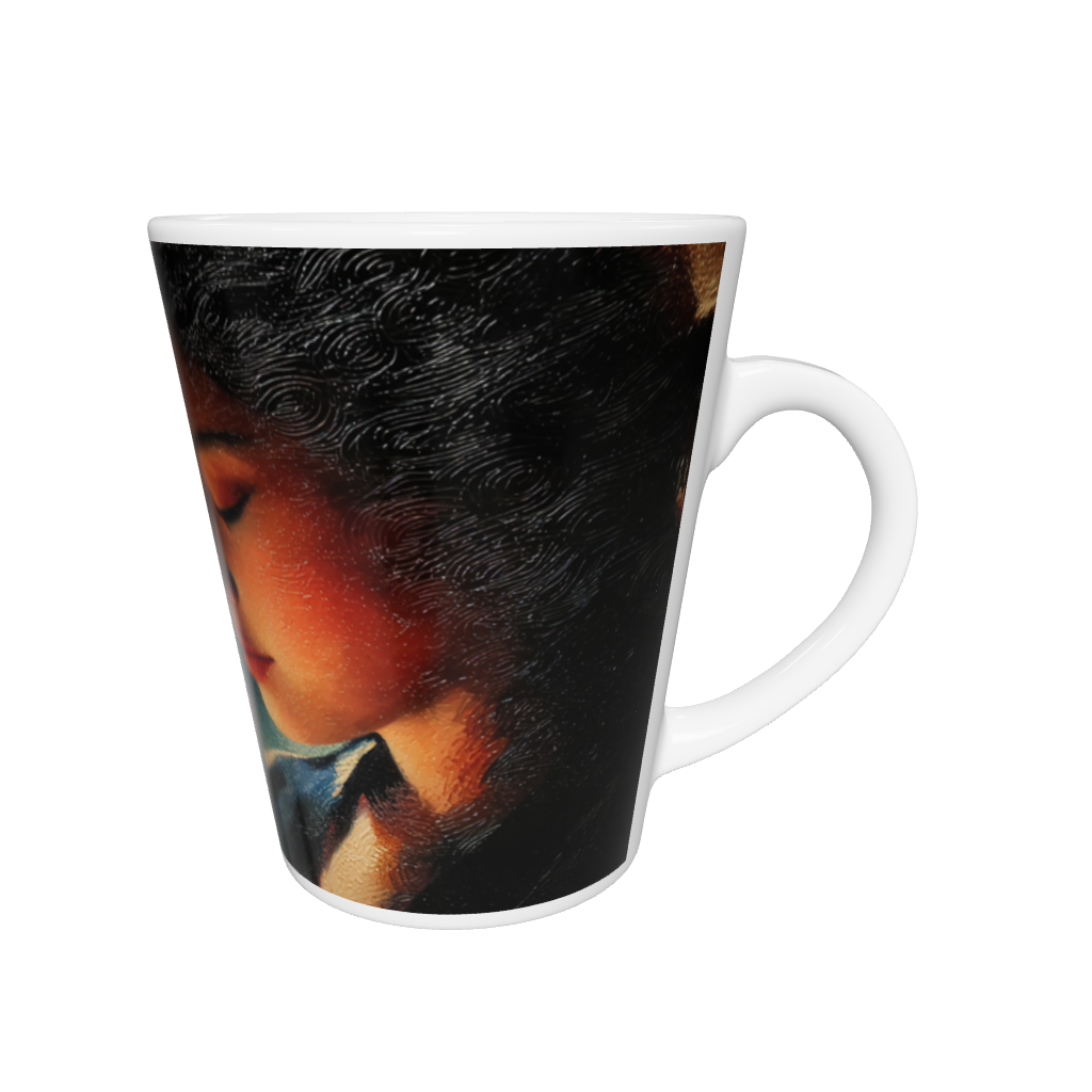Die Komposition verbindet realistisches Porträt mit abstrakter Symbolik und lässt Raum für Interpretation – ein Bild von Erinnerung, Sehnsucht und innerer Ruhe. Auf der konischen Tassenform entfaltet sich diese meditative Szene wie ein Traum in Farben.