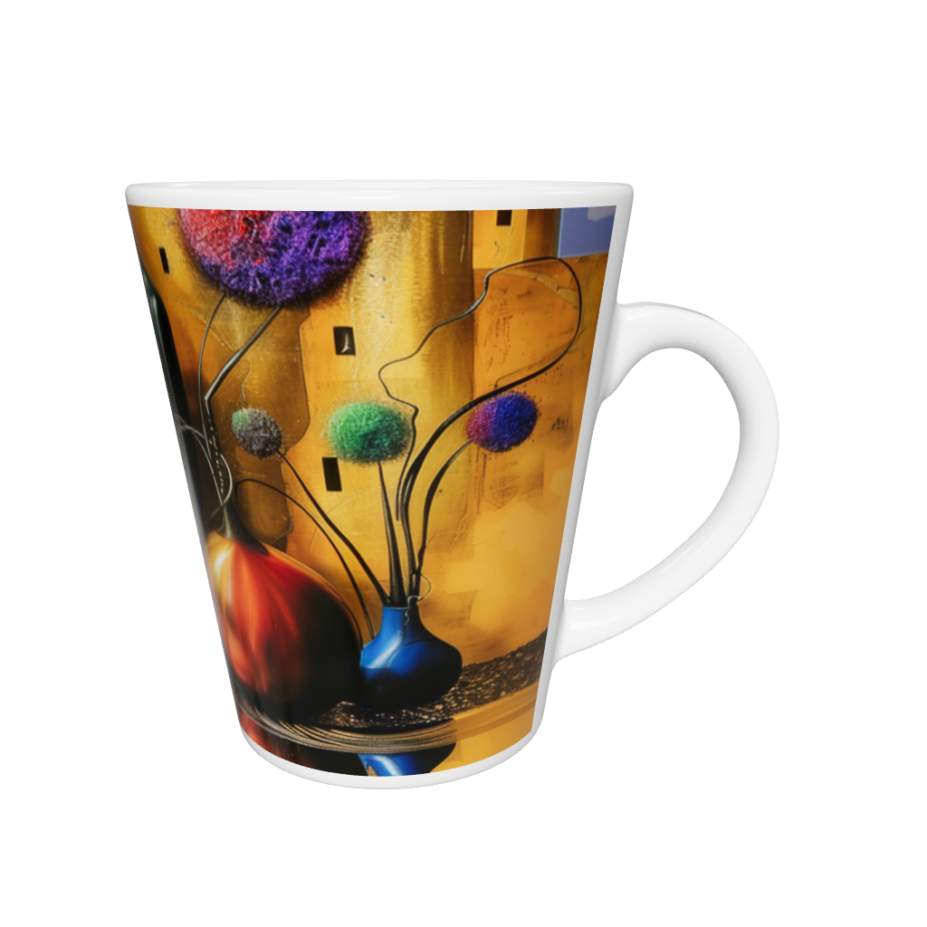 Die Latte-Tasse Blüten & Formen präsentiert ein außergewöhnliches Kunstmotiv: Eine abstrakte Frauenfigur in glänzendem Schwarz thront zwischen farbenprächtigen Vasen und kugelförmigen Blüten. Die intensive Farbpalette aus Gold, Rot, Blau und Grün erzeugt eine fast magische Atmosphäre.