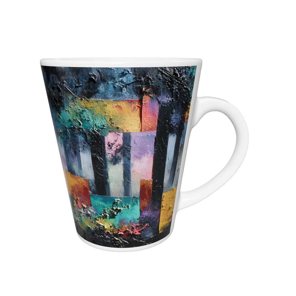 „Latte-Tasse konisch mit Kunstmotiv: Abstrakter Wald, Lichtdurchbruch in Gelb und Weiß, geometrische Farbflächen in kräftigen Tönen ergänzen die Szene“