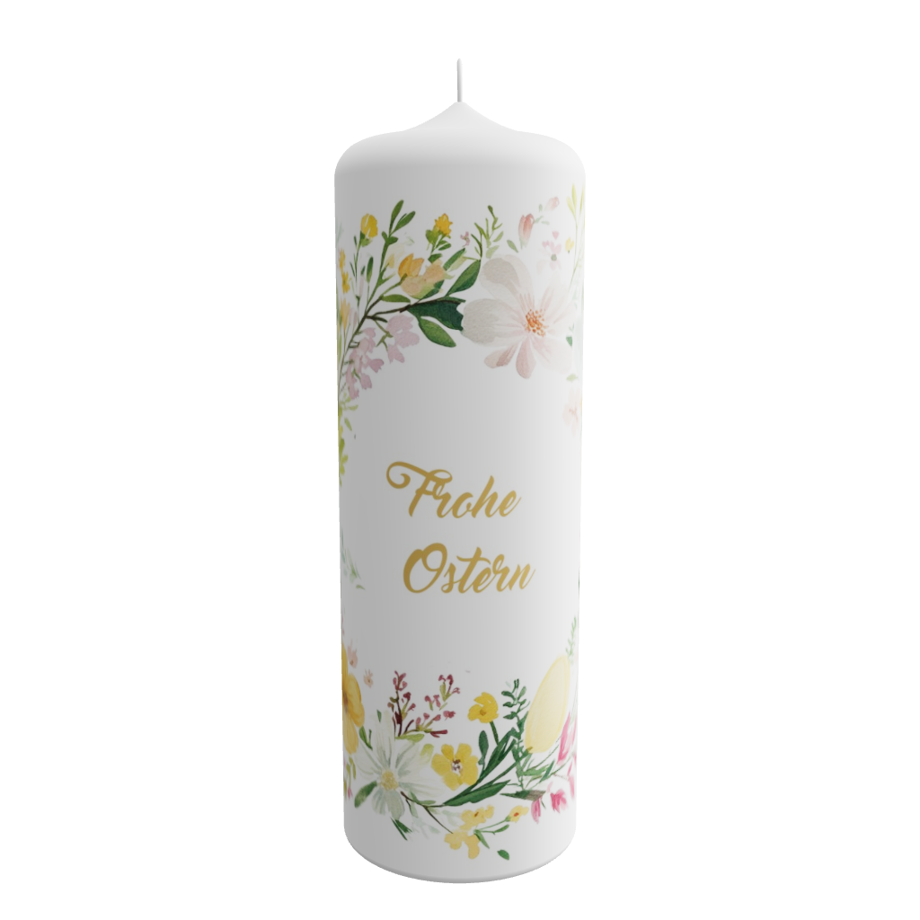 Osterkerze mit zartem Blütenkranz & goldenem „Frohe Ostern“-Schriftzug. Elegant, festlich & perfekt als Geschenk oder feine Osterdeko.