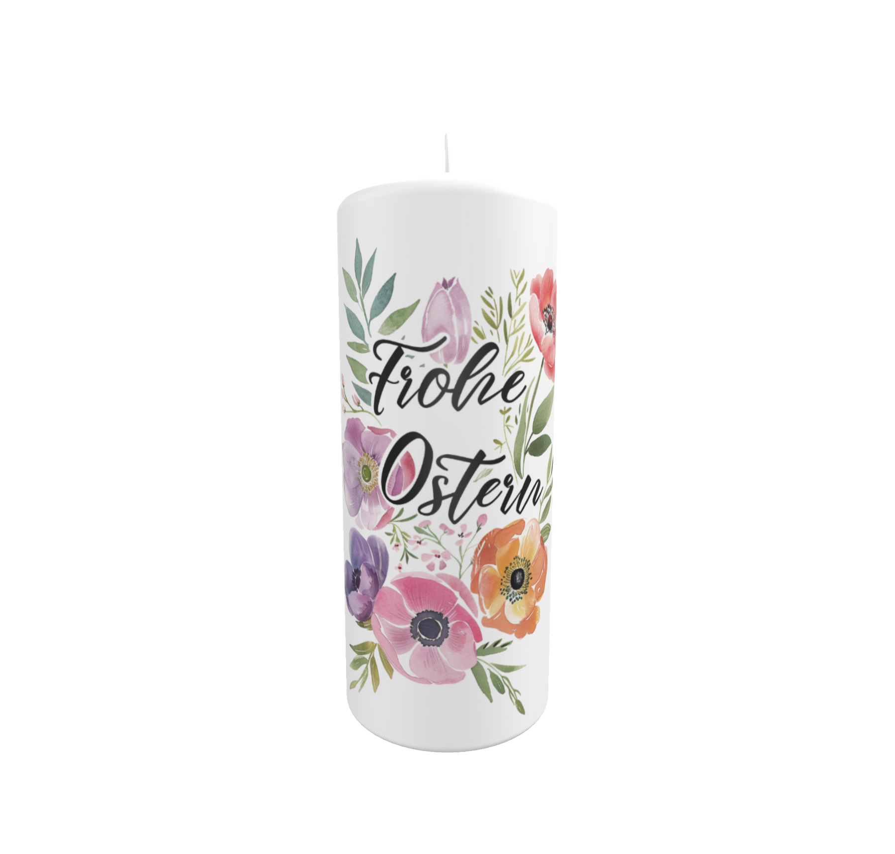 Diese zauberhafte Osterkerze bringt den Frühling in dein Zuhause! Umgeben von einem farbenfrohen Kranz aus Aquarellblüten in Rosa, Lila, Orange und Rot strahlt der stilvolle Schriftzug „Frohe Ostern“ auf edlem Weiß. Die florale Gestaltung verleiht der Kerze eine frische, fröhliche Note – ideal für den Ostertisch, als Geschenk oder liebevolle Aufmerksamkeit.