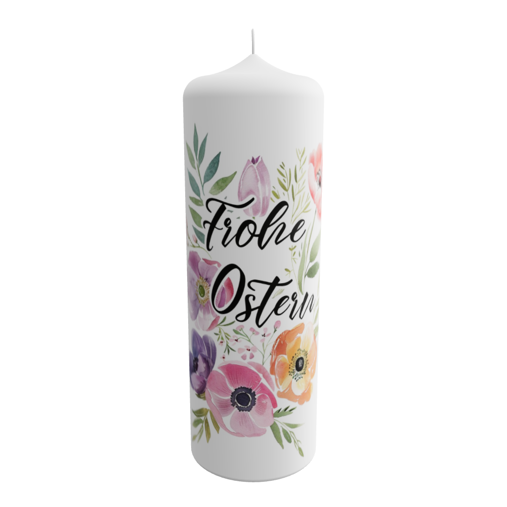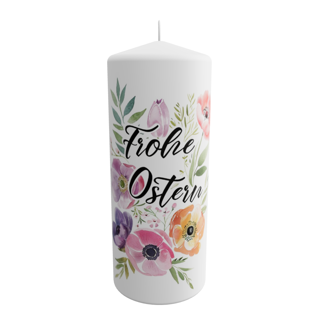 Weiße Osterkerze mit bunten Aquarellblumen und dem Schriftzug „Frohe Ostern“ in eleganter Handschrift.