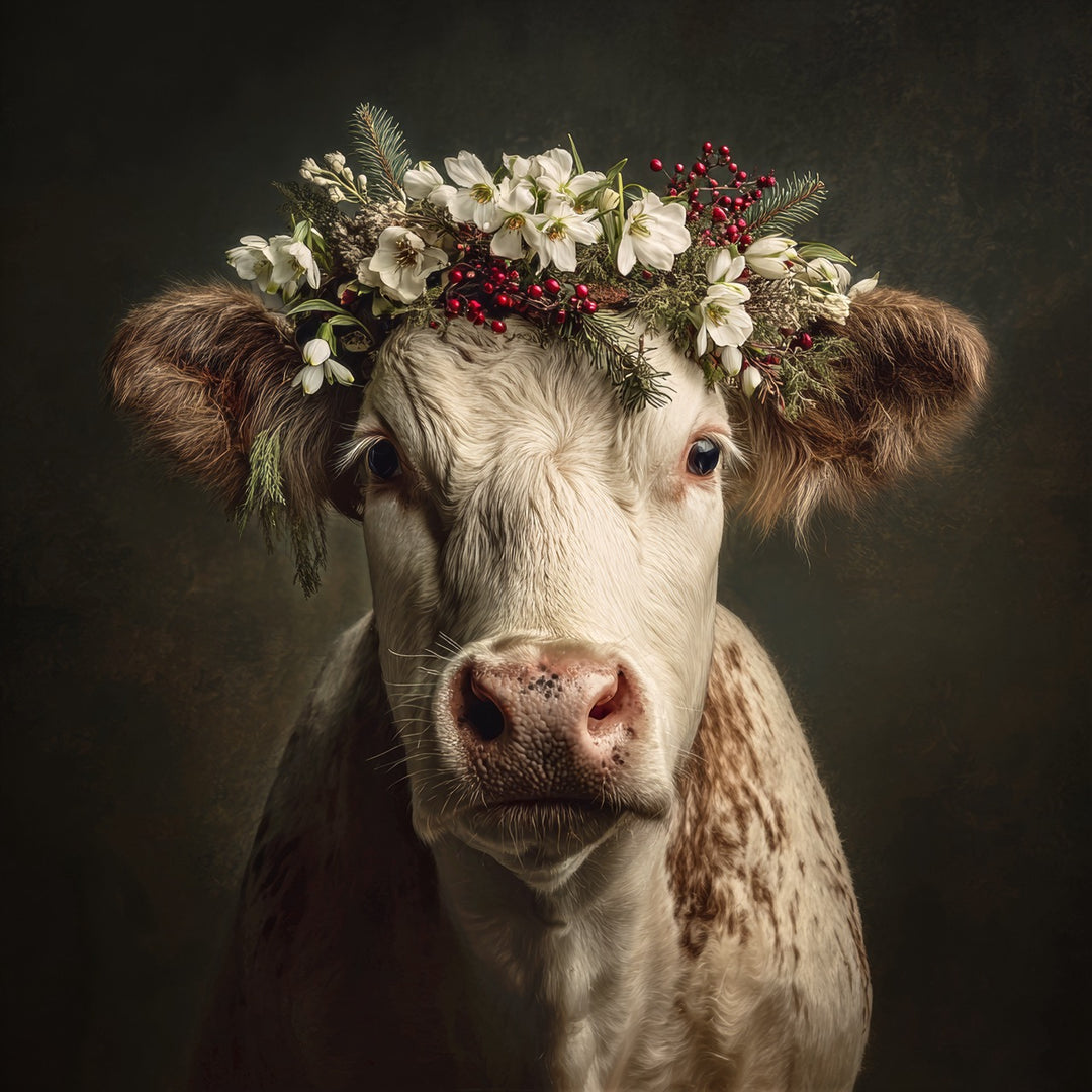 Stolze Kuh mit rotem Blütenkranz