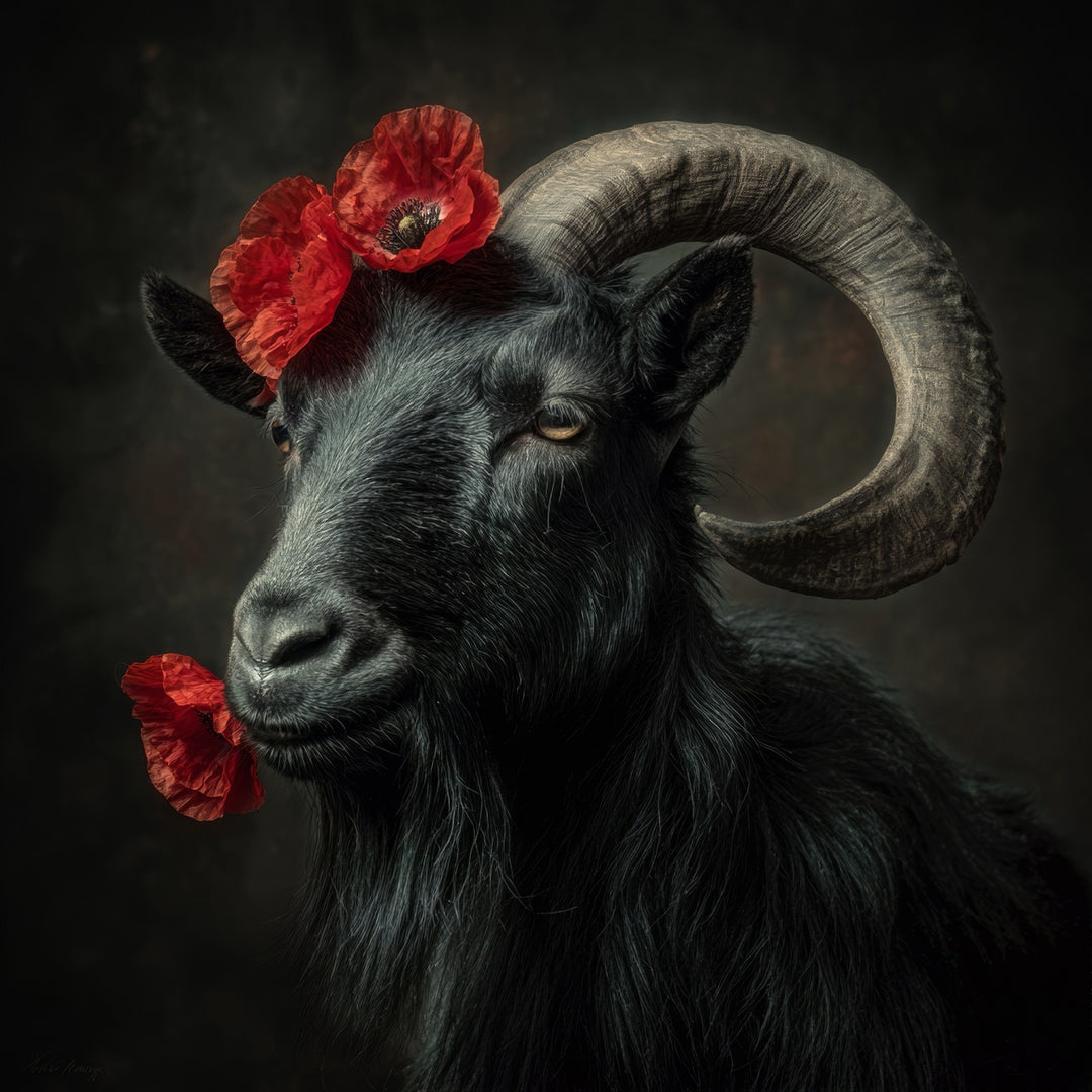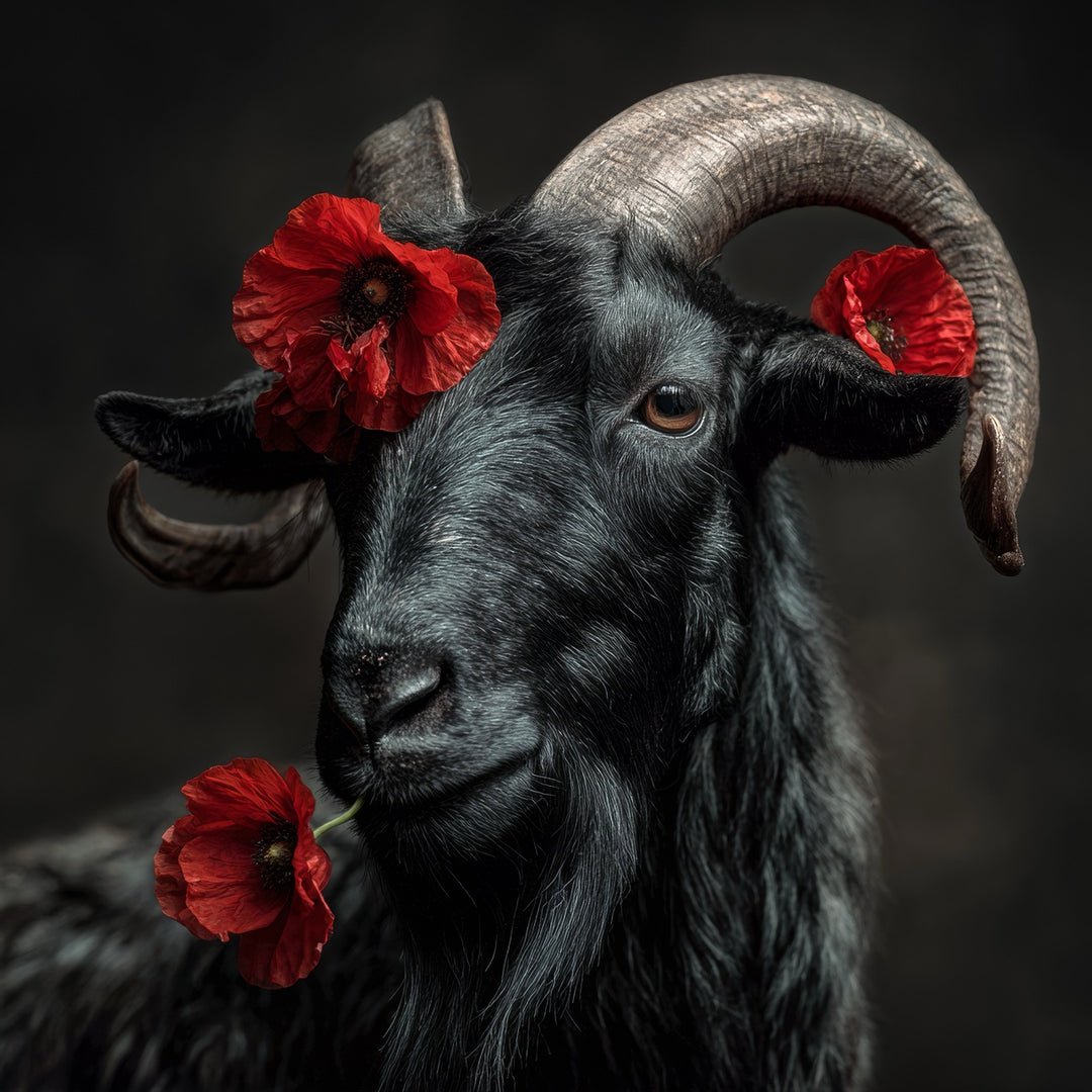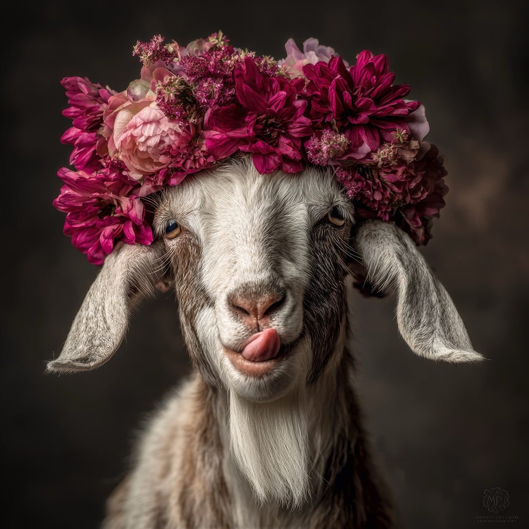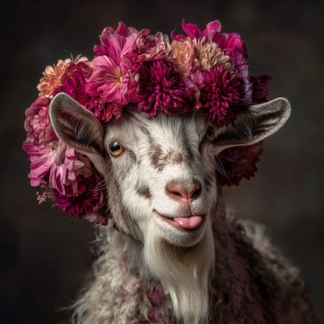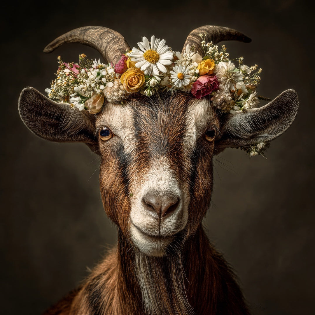Die Ziege mit Kranz aus bunten Wiesenblumen